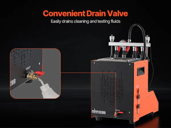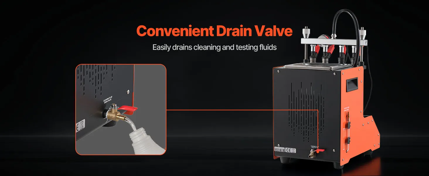 Questa macchina per la pulizia degli iniettori di carburante è dotata di una valvola di scarico che consente di drenare facilmente i liquidi di pulizia e di prova usati.