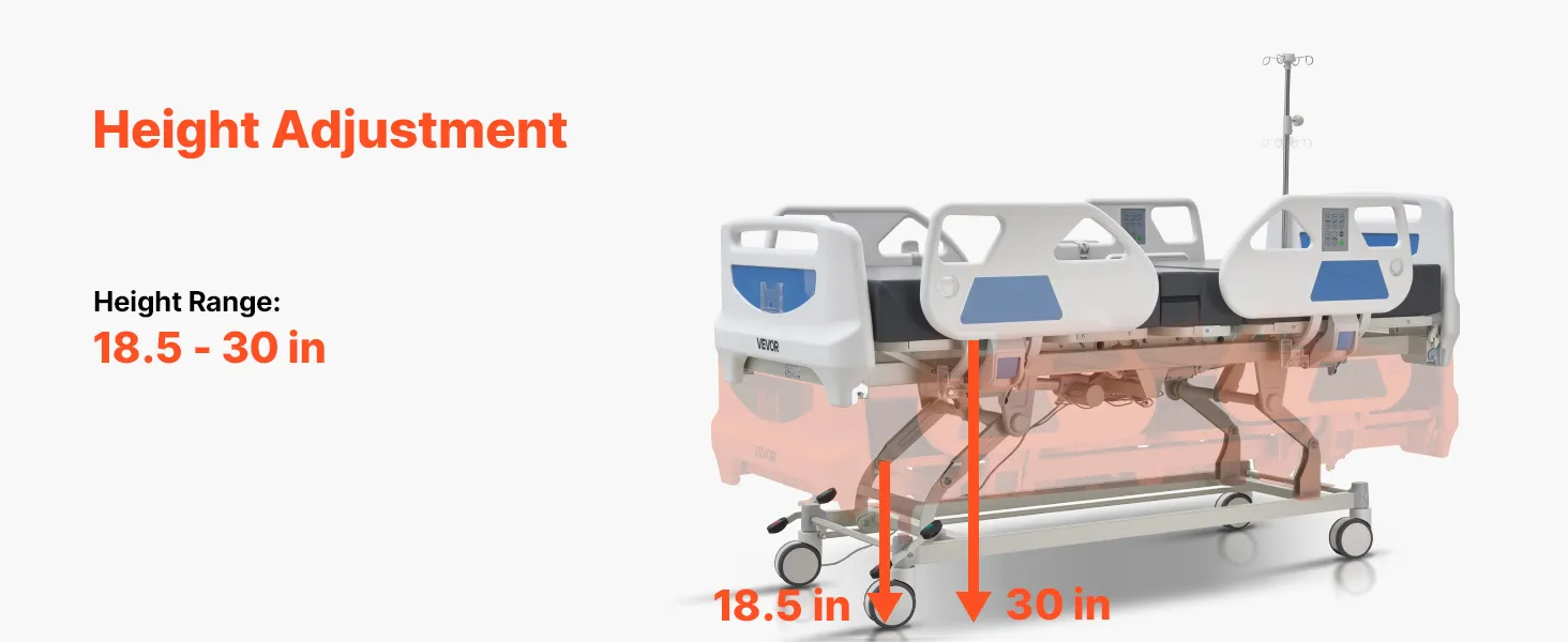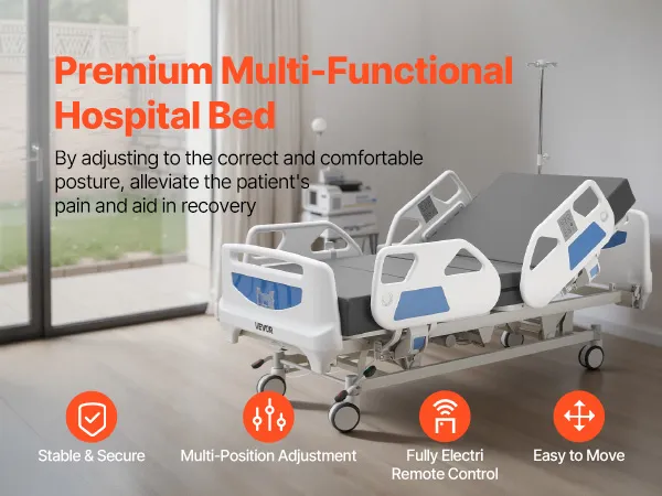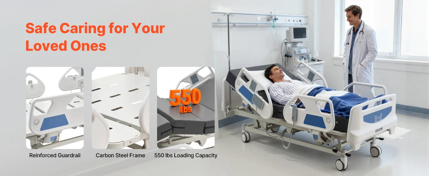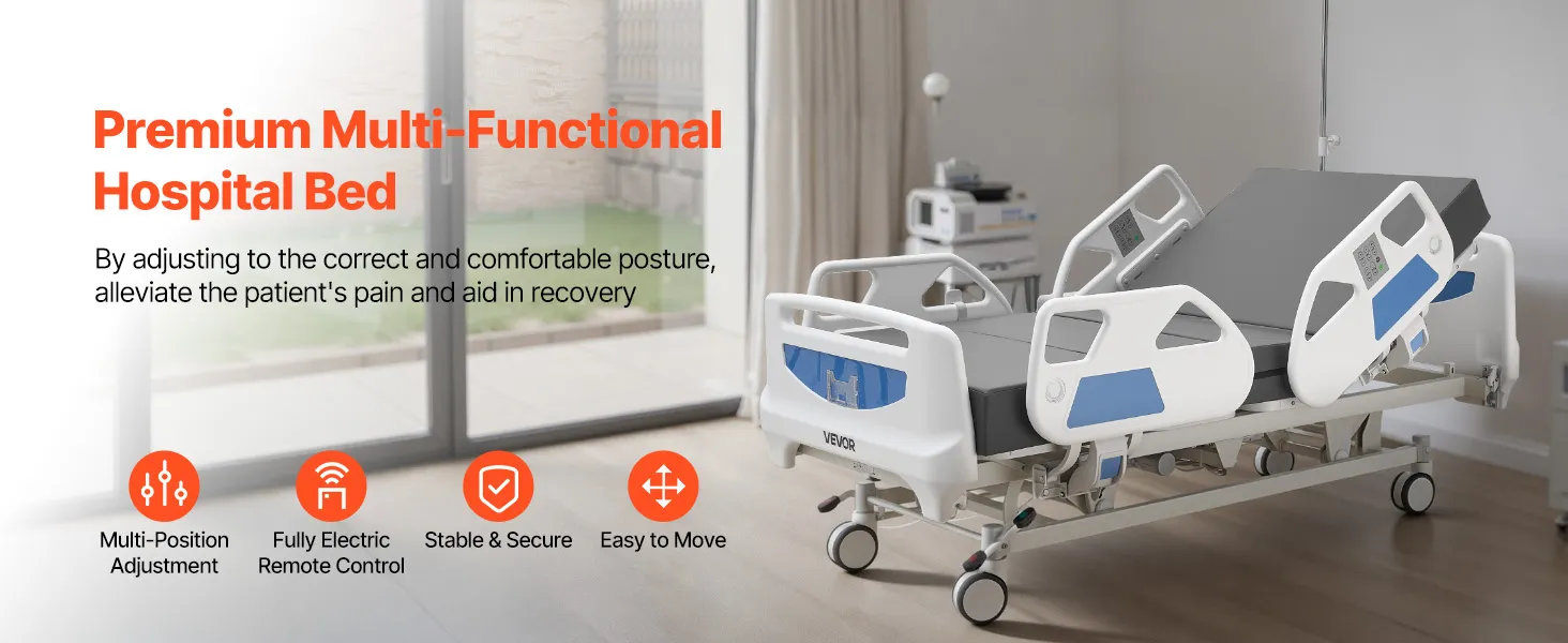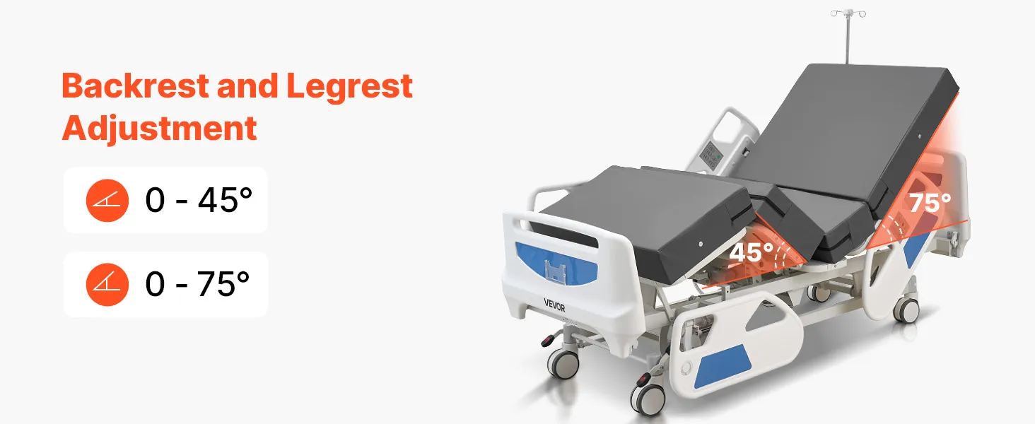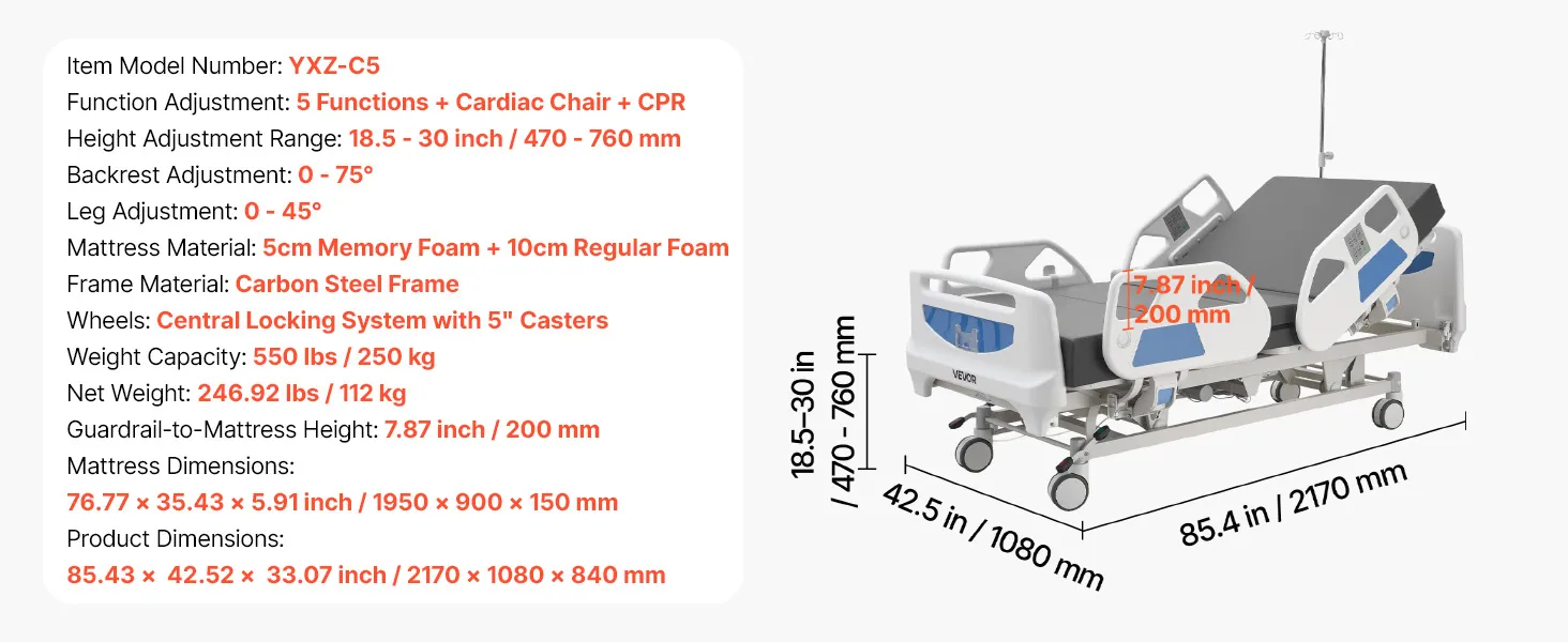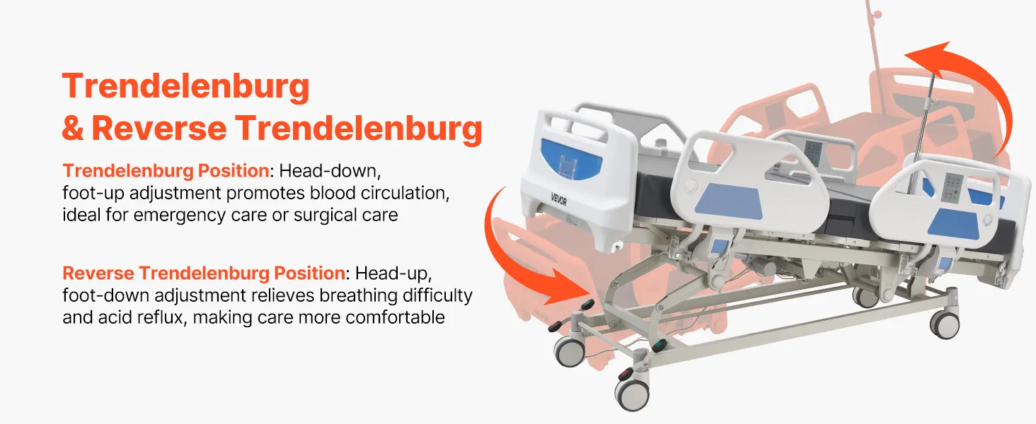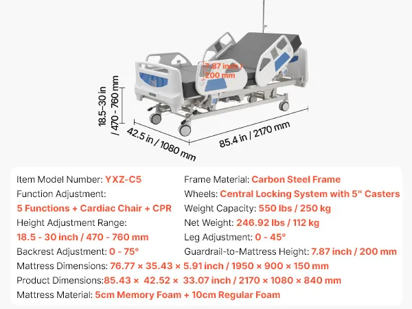 VEVOR Letto Ospedaliero Elettrico 5 Funzioni per l'Assistenza Domiciliare con Sedia Cardiaca, Funzione CPR, Letto per Degenza Posizioni Trendelenburg e Trendelenburg Inversa Ruote Bloccabili