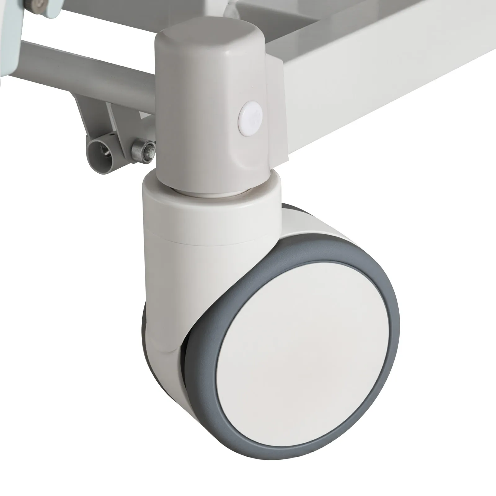 Sistema di bloccaggio centralizzato a pedale: questo sistema migliorato per il letto medico elettrico è dotato di ruote da 5 pollici e pedali del freno integrati. Premere la leva rossa per bloccare tutte le ruote e ottenere una stabilità ottimale