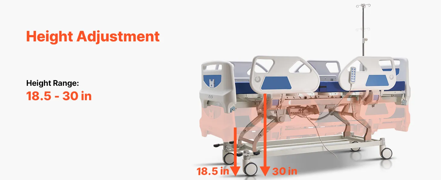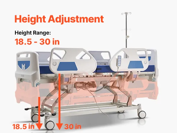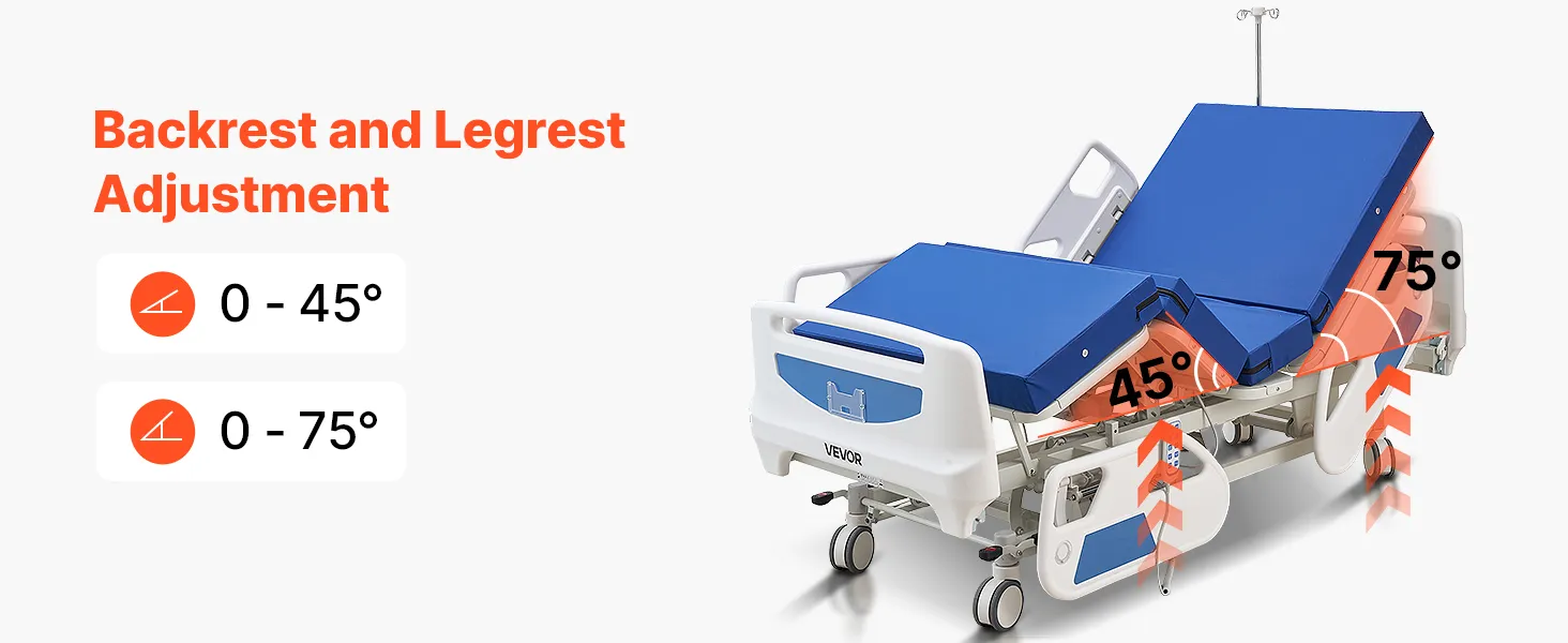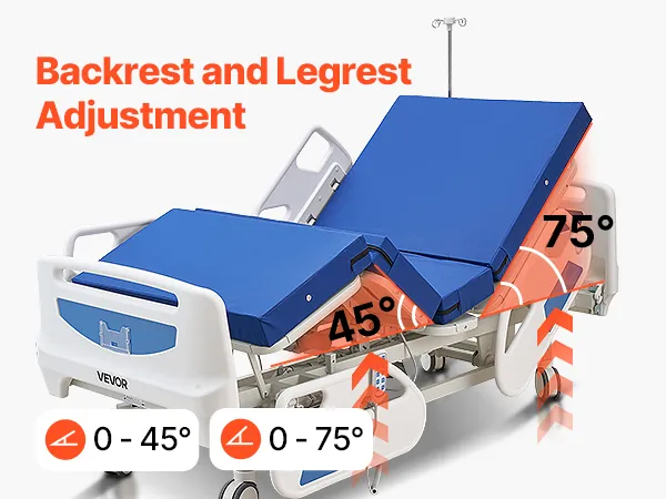 Regolazione elettrica a 5 funzioni: il letto ospedaliero elettrico supporta la regolazione dello schienale da 0 a 75°, la regolazione delle gambe da 0 a 45°, l'altezza regolabile da 470 mm a 760 mm, oltre alla posizione Trendelenburg e Trendelenburg inversa per un'assistenza più flessibile e confortevole