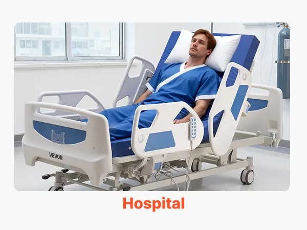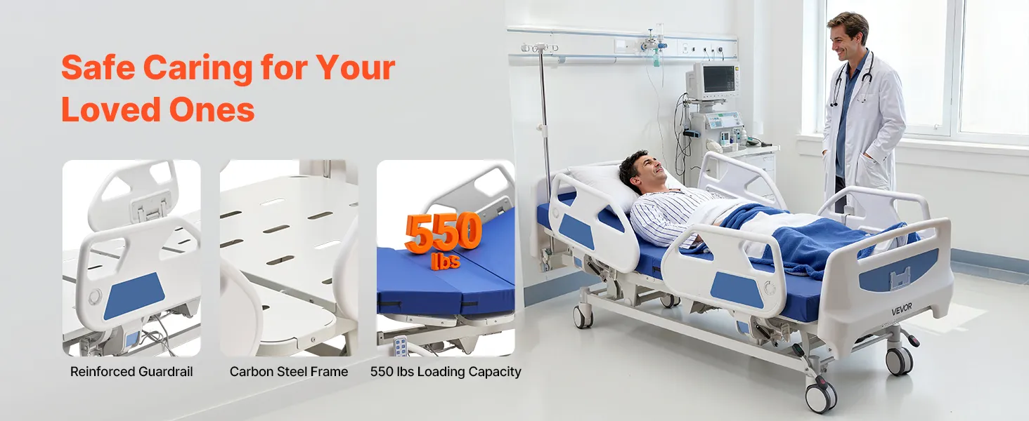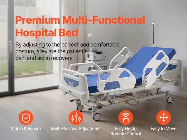 Questo letto ospedaliero elettrico combina una regolazione fluida a 5 funzioni, un sistema di bloccaggio centralizzato, un materasso in schiuma ad alta densità 30D e una capacità di carico di 250 kg per offrire comfort, sicurezza e supporto affidabili per l'assistenza quotidiana in ospedale o a casa.