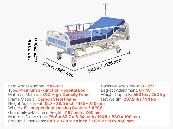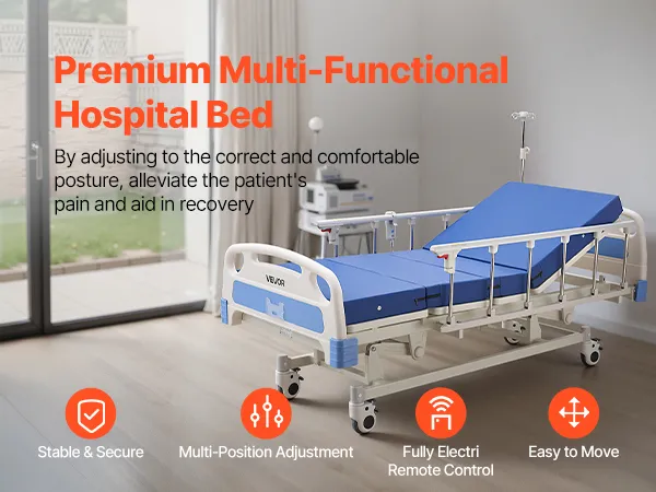 Questo letto ospedaliero completamente elettrico combina una regolazione fluida a 3 funzioni, un materasso in schiuma 30D ad alta densità che offre un buon supporto, ruote con bloccaggio sicuro e una robusta capacità di carico di 250 kg per garantire comfort, sicurezza e supporto affidabili.