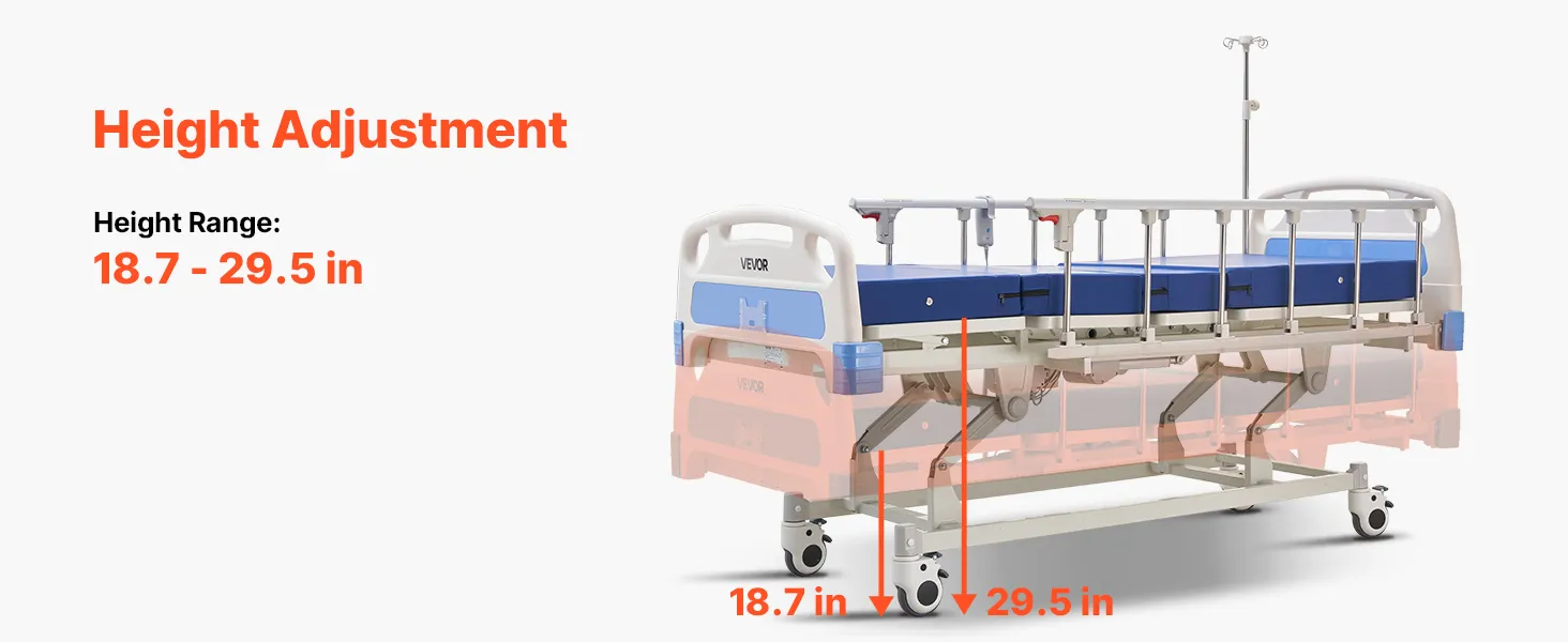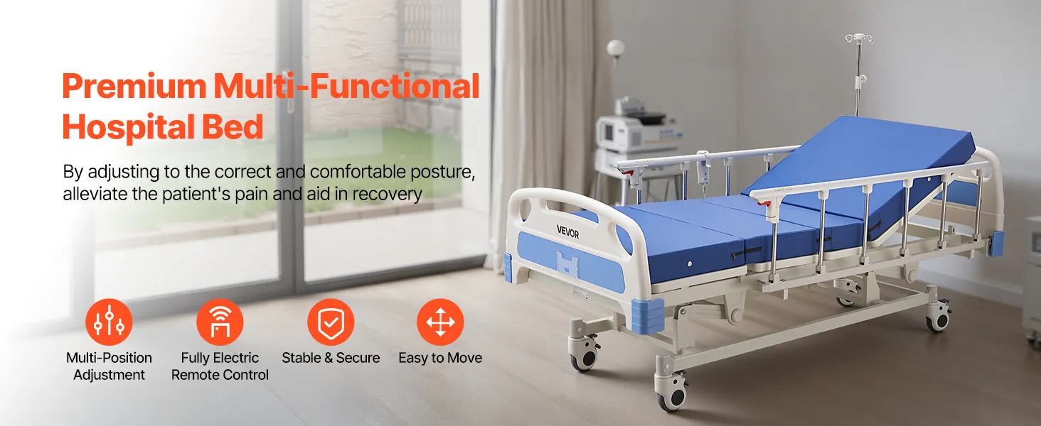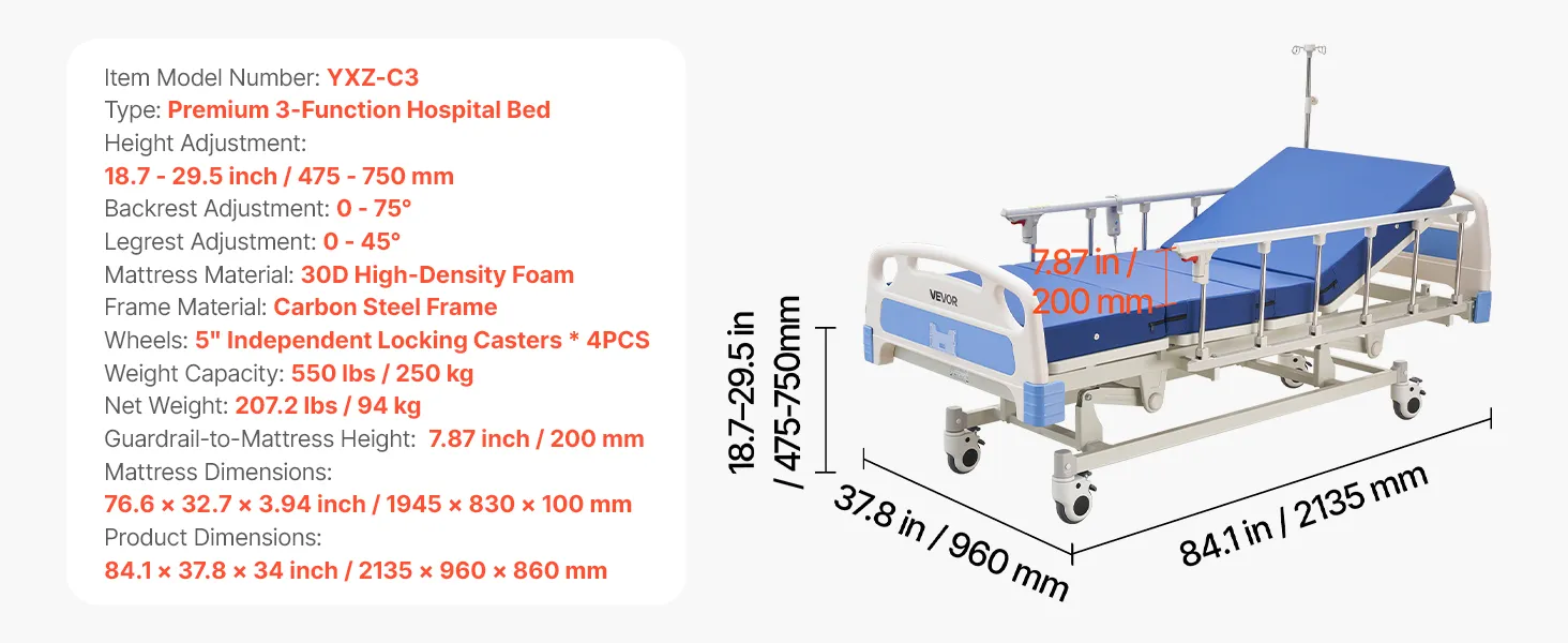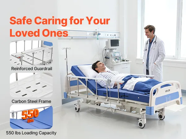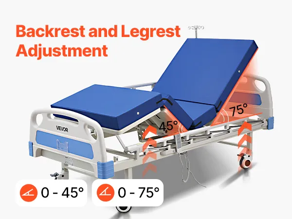 VEVOR Letto Ospedaliero Elettrico per Degenza Letto Ospedaliero Capacità di Carico 250 kg per l'Assistenza Domiciliare, Angolo Schienale Regolabile 0-75° Altezza Regolabile 475-750mm 3 Funzioni