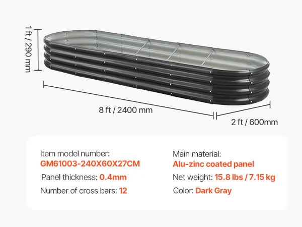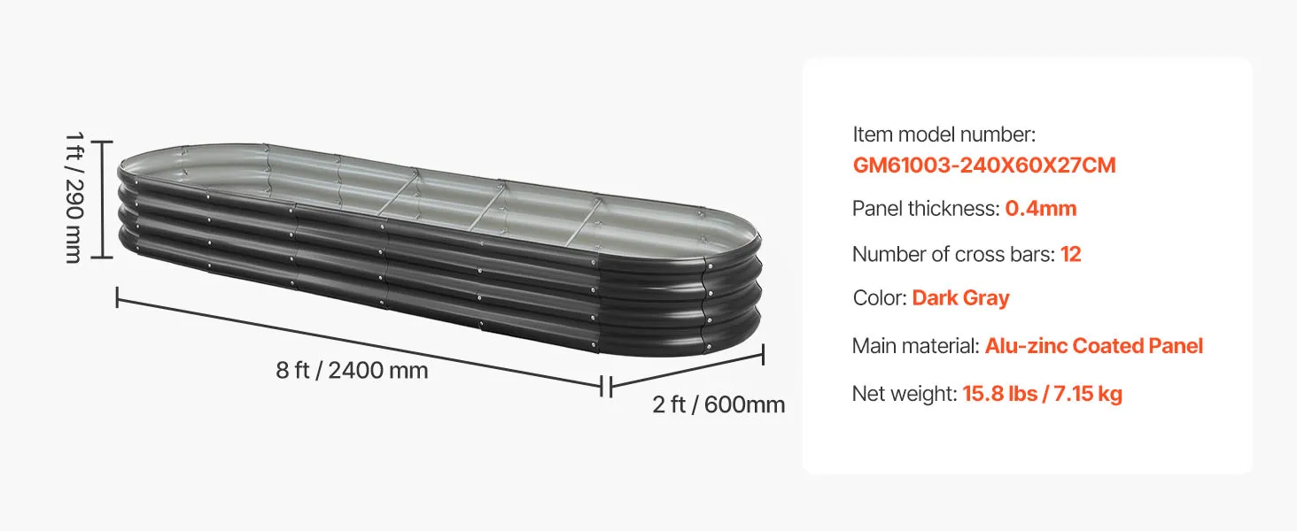 VEVOR Letto da Giardino in Acciaio Zincato 2400 x 600 x 290 mm, Design a Fondo Aperto, Grande Aiuola Rialzata per la Coltivazione di Verdure, Fiori, Erbe Aromatiche e Piante Grasse, Grigio Scuro