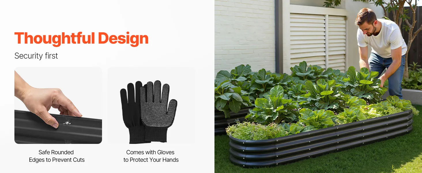 Il letto rialzato è dotato di bordi arrotondati per una maggiore sicurezza. Viene fornito anche con guanti per una maggiore protezione delle mani.