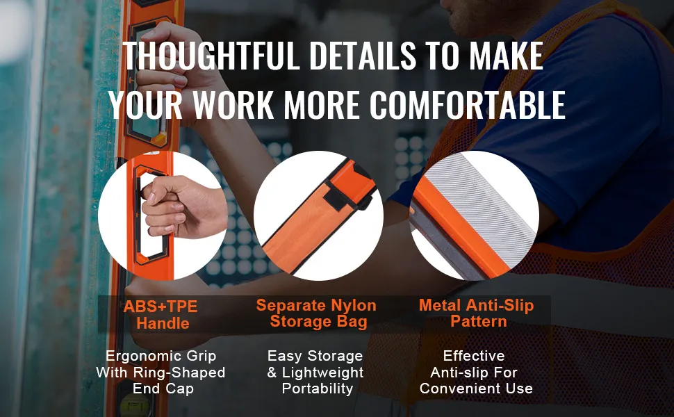 Il design antiurto, rinforzato con spessi cappucci terminali, assicura una precisione a lungo termine anche dopo impatti o cadute. Questo livello è costruito per resistere a condizioni difficili, rendendolo perfetto per un uso intensivo e garantendo risultati affidabili nel tempo.