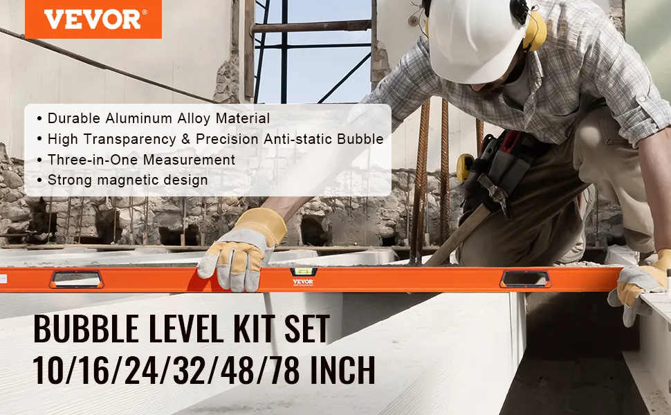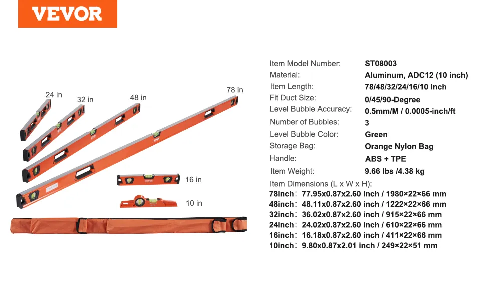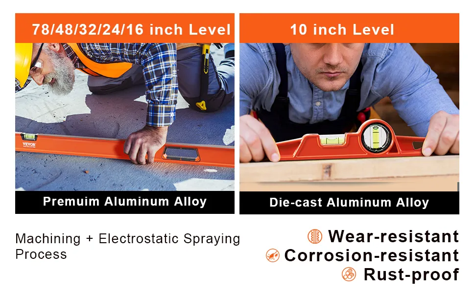 Robusta Struttura in Alluminio: questa livella a bolla è costruita con una struttura del corpo in alluminio, che non solo garantisce durata, ma fornisce anche elevata resistenza e resistenza all'usura. Il set include lunghezze di 48/24/16/10 pollici. Hai l'attrezzatura perfetta per i tuoi progetti.