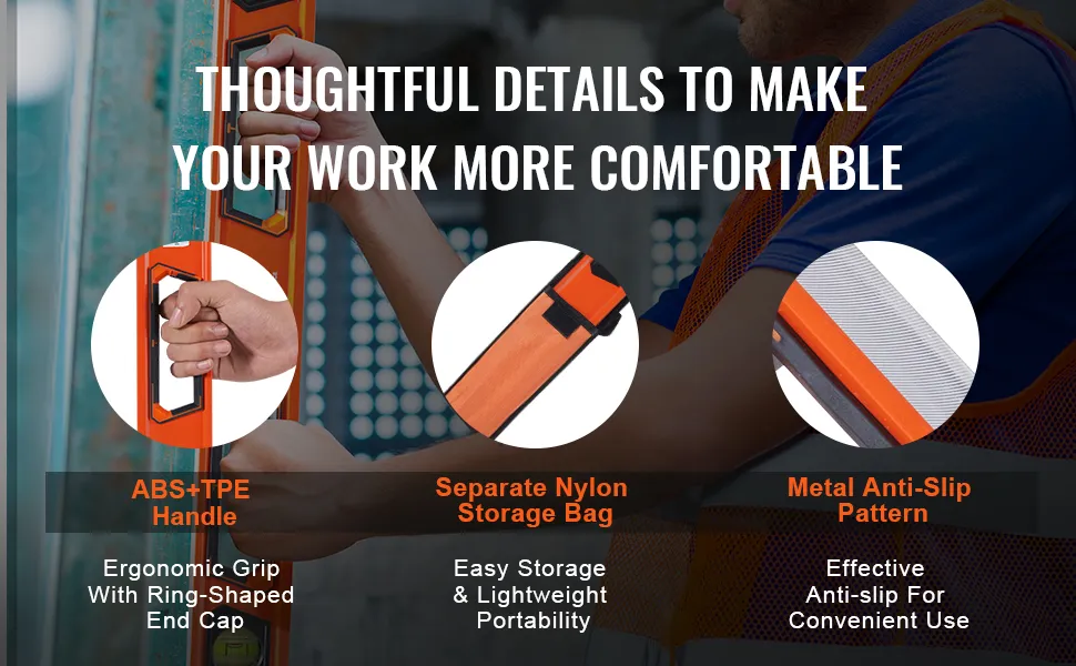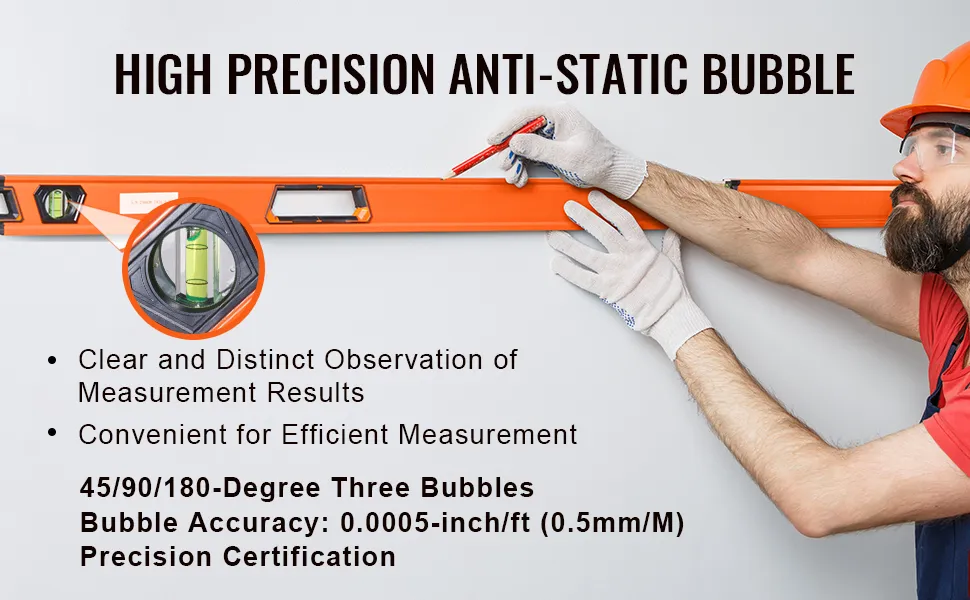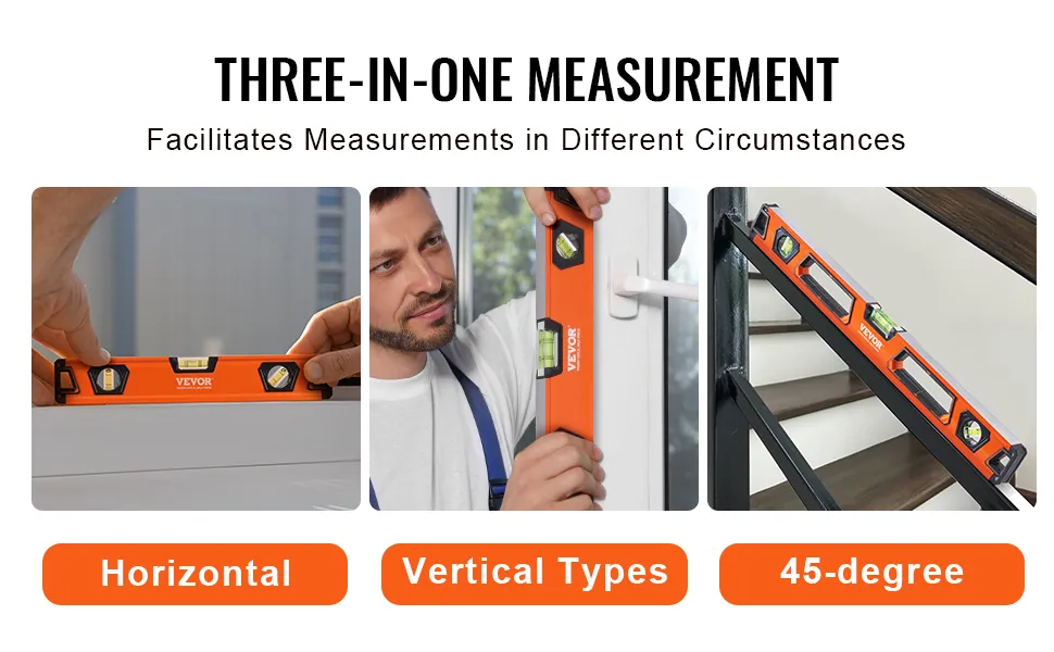 Misura 3-in-1: è dotato di 3 tipi di misurazioni: angolo di 45 gradi, orizzontale e verticale, per soddisfare le diverse esigenze di misurazione. Il livello è adatto a vari scenari come l'industria della decorazione, l'industria delle costruzioni, il settore industriale e le misurazioni domestiche.