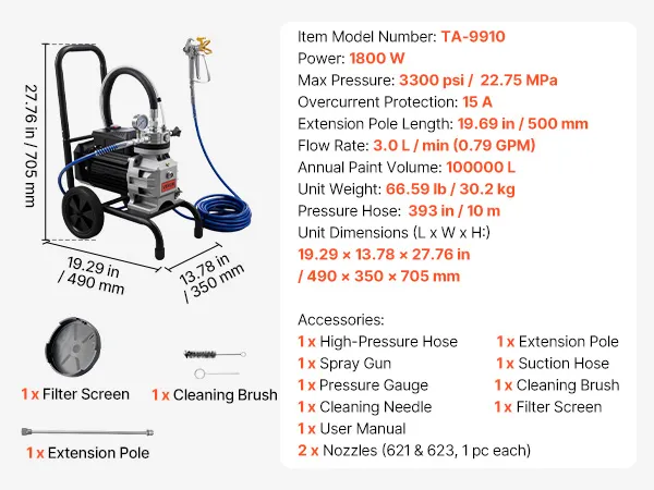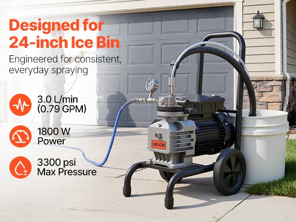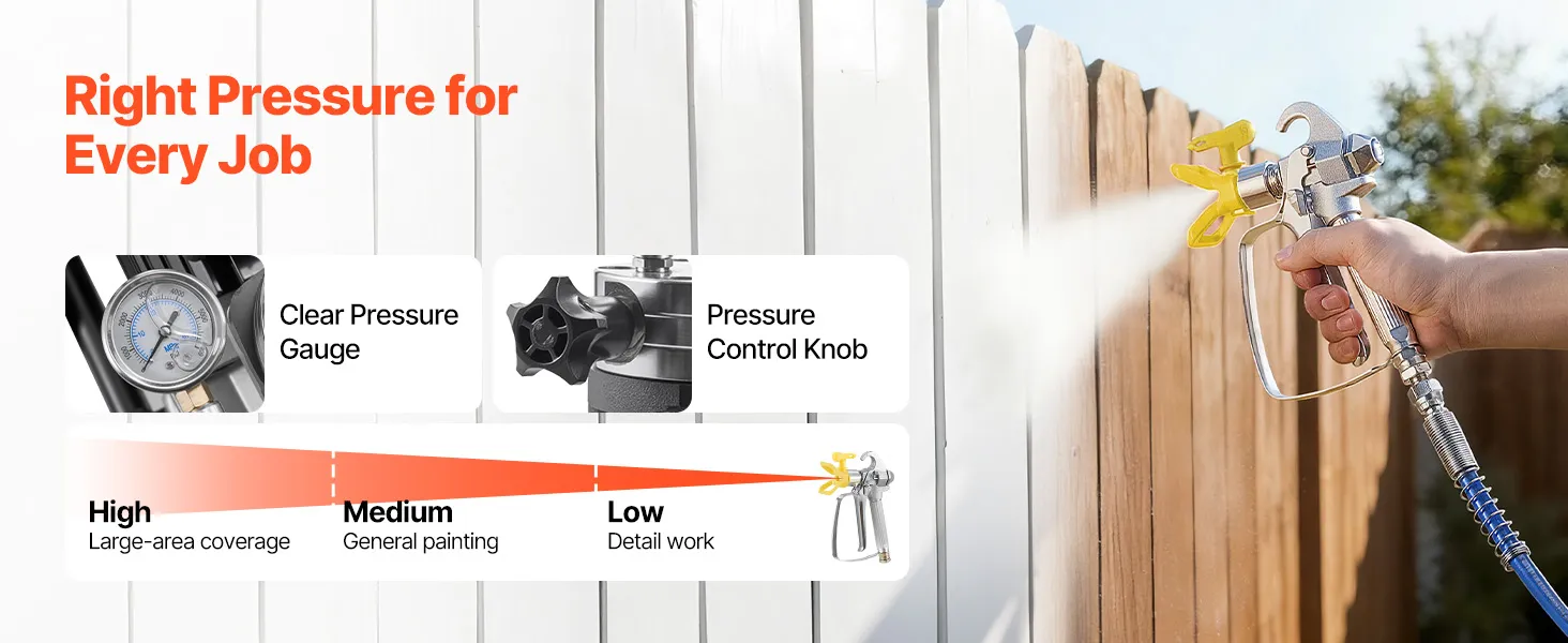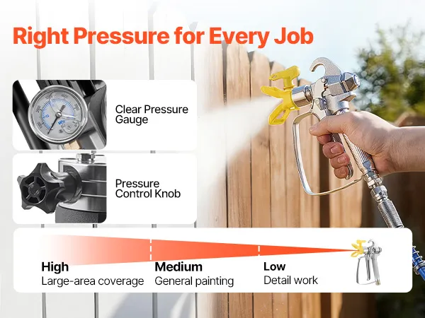 Controllo preciso della pressione: Lo spruzzatore airless con carrello è dotato di una manopola regolabile e di un manometro chiaro, che consente un controllo preciso dello spruzzo per lavori dettagliati o su grandi superfici