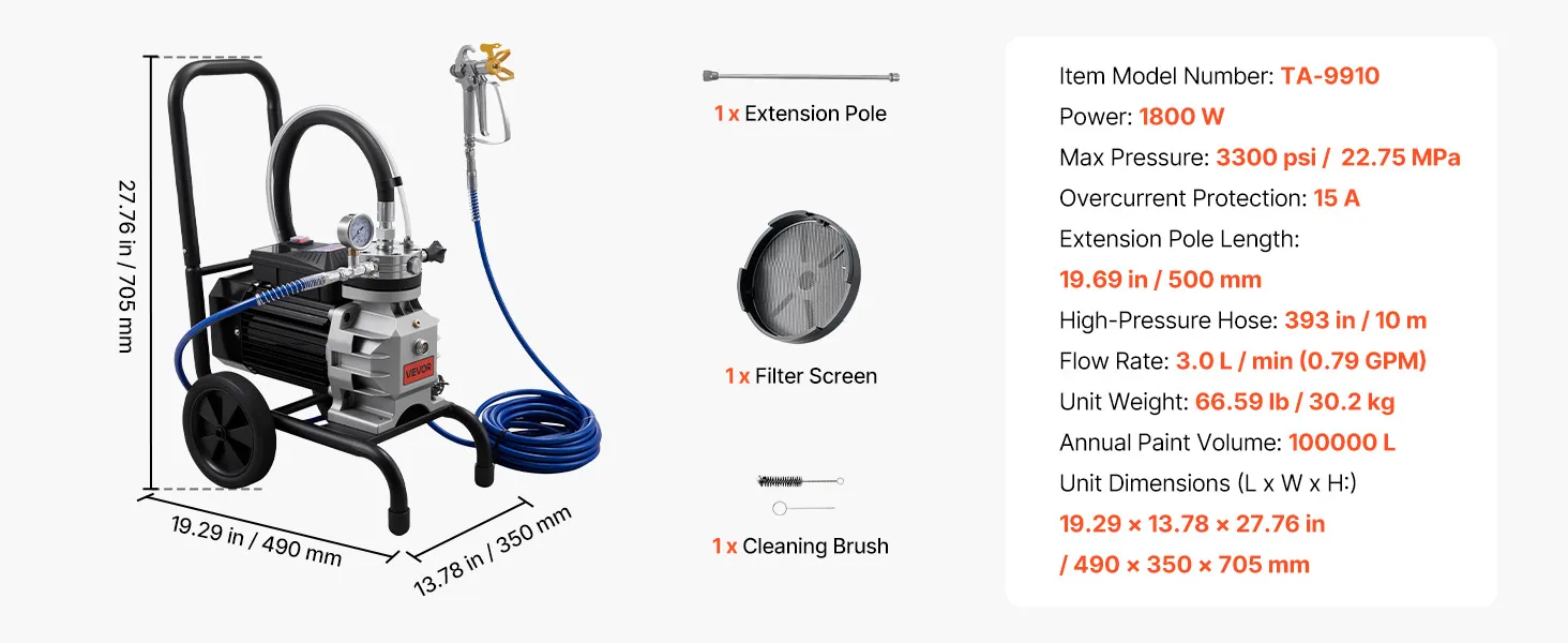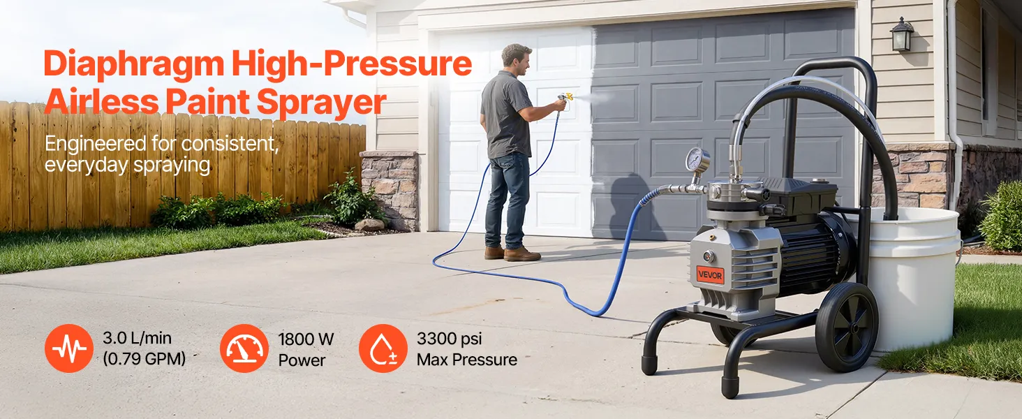 VEVOR Spruzzatore di Vernice Airless a Membrana 1800 W Spruzzatore di Vernice a Carrello Pressione max 22,75 Mpa Tubo Flessibile 10m, Macchina a Spruzzo per Verniciatura Flusso 3,0 L/min per Parete