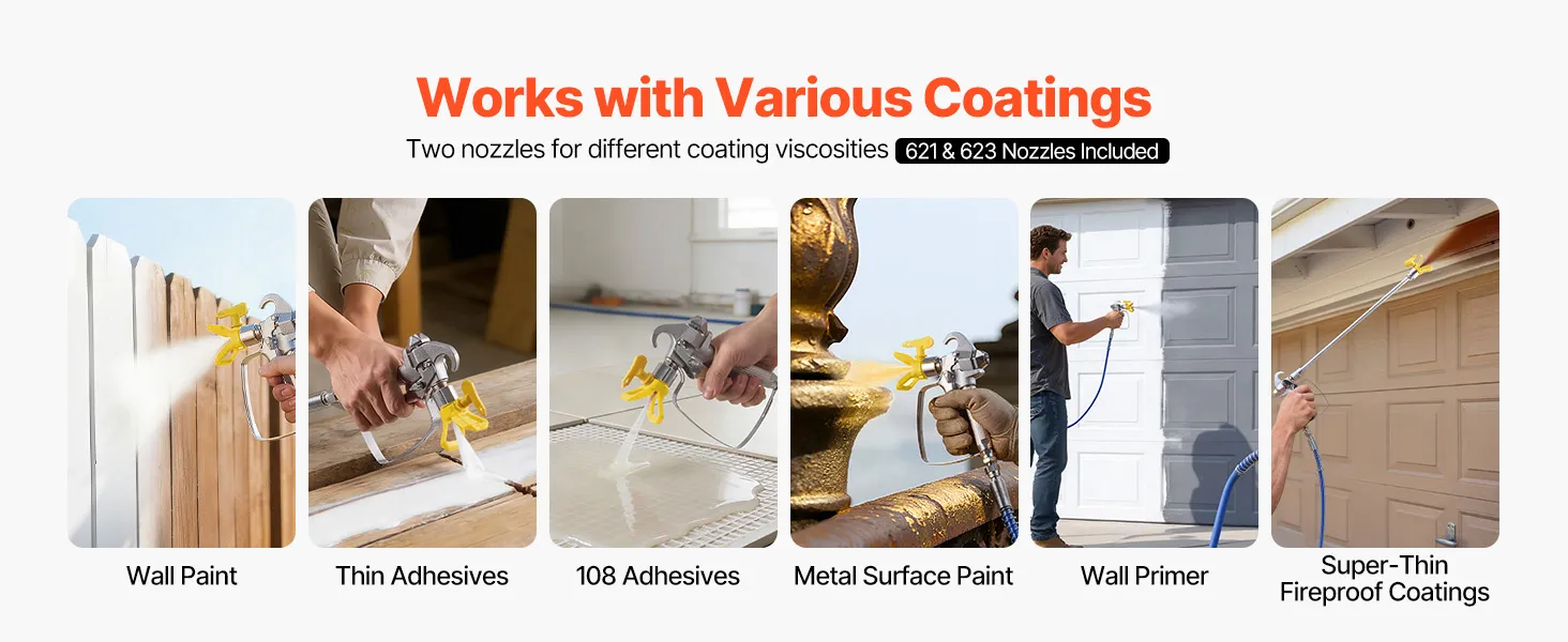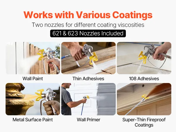 Compatibile con più rivestimenti: Questo spruzzatore di vernice commerciale è compatibile con vernici per pareti interne, adesivi diluiti, sigillanti per pareti e rivestimenti per superfici metalliche. Ideale per progetti di ristrutturazione che utilizzano materiali diversi