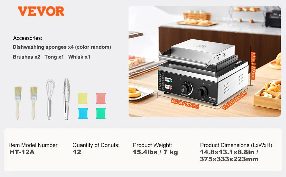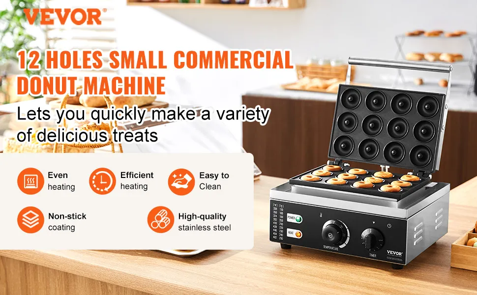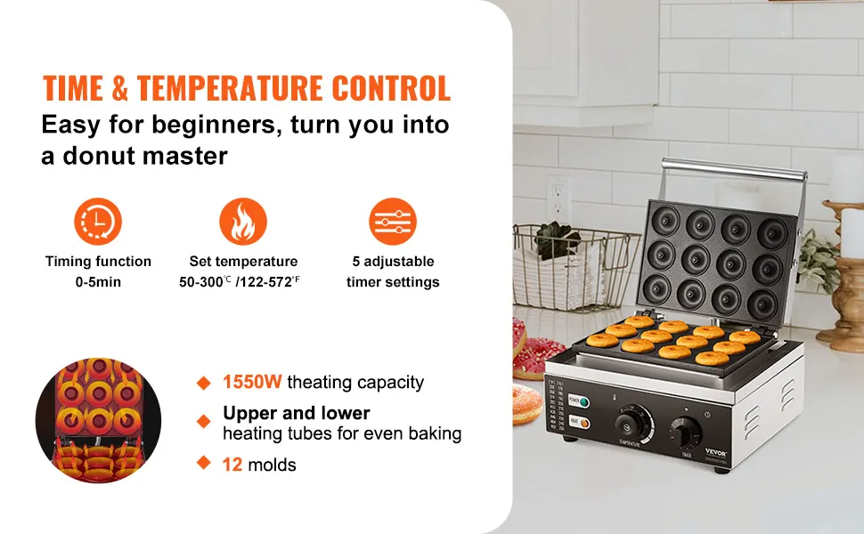 VEVOR Macchina per Ciambelle Elettrica 1550 W Macchina per Ciambelle Commerciale con Superficie Antiaderente, Entrambi Lati, Produce 12 Ciambelle, Temperatura 50-300 ℃, per Ristorante, Uso Domestico