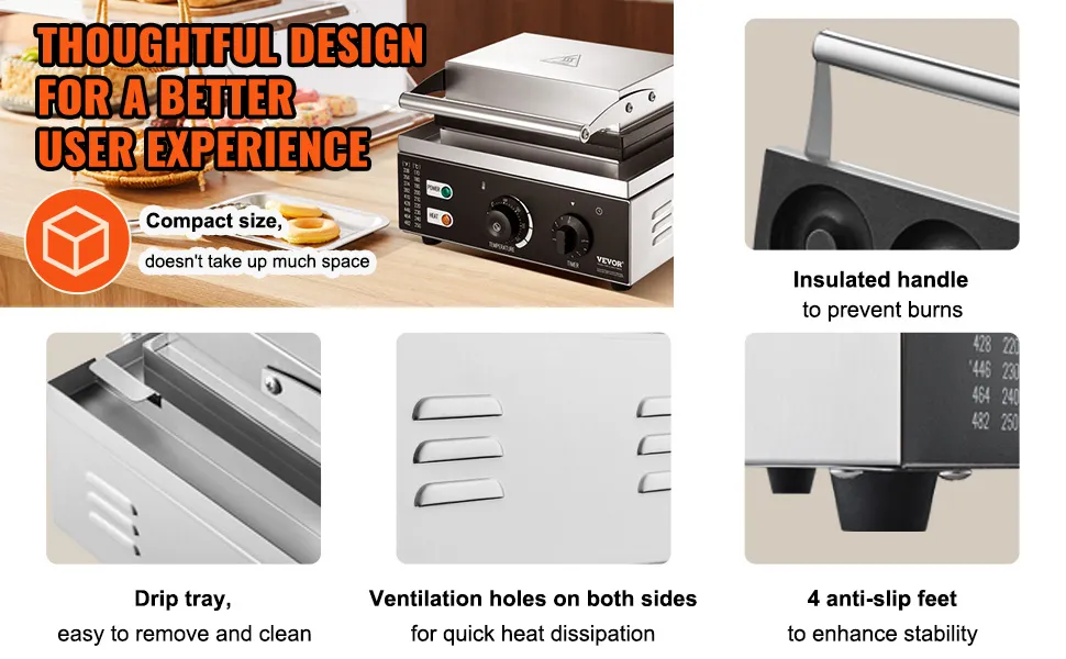 Design incentrato sull'utente: le caratteristiche della nostra macchina per ciambelle per waffle commerciale includono un manico in acciaio inossidabile resistente al calore per evitare ustioni. Un vassoio raccogligocce facile da staccare per la pulizia. Prese d'aria laterali per un raffreddamento più rapido, garantendo che la macchina funzioni in modo efficiente. Piedini antiscivolo per stabilità e usabilità della macchina per ciambelle.