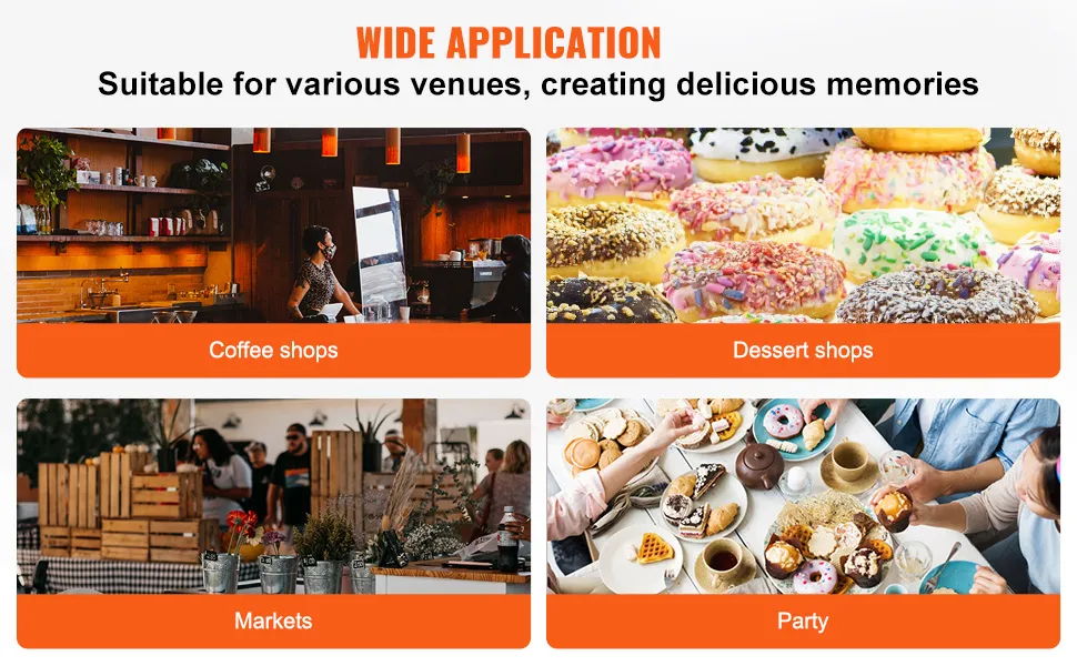 Ampia applicazione: in grado di creare deliziose ciambelle morbide all'interno e croccanti all'esterno dal sapore eccezionale. Permette l'aggiunta di decorazioni come cioccolato e caramelle per una varietà di gusti. Ideale per tutti i luoghi commerciali immaginabili, come panifici, hotel, ristoranti a buffet, snack bar, minimarket, centri commerciali, supermercati, caffetterie e case da tè, la nostra macchina per ciambelle è la scelta perfetta per loro.