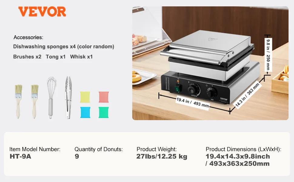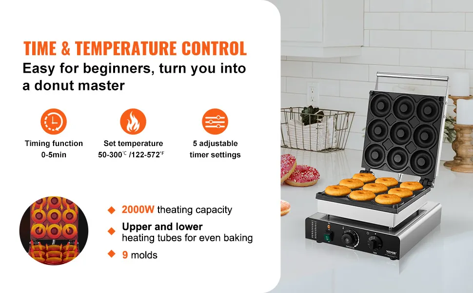 VEVOR Macchina per Ciambelle Elettrica 2000 W Macchina per Ciambelle Commerciale con Superficie Antiaderente, Entrambi Lati, Produce 9 Ciambelle, Temperatura 50-300 ℃, per Ristorante, Uso Domestico