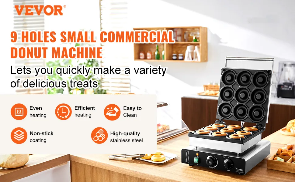 Prestazioni di riscaldamento superiori: utilizzando una padella piana riscaldante su entrambi i lati, questa macchina per ciambelle commerciale garantisce prodotti da forno uniformi, in grado di preparare 9 ciambelle alla volta (diametro 3,5 pollici/90 mm, spessore 1,2 pollici/30 mm). Il rivestimento antiaderente in PTFE facilita la cottura rapida e la facile pulizia.