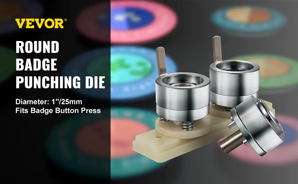 Il modello di creazione di bottoni da 1 pollice / 25 mm è compatibile con i produttori di badge a bottone rosso VEVOR. Quando i tuoi stampi sono danneggiati o necessitano di uno stampo di dimensioni diverse per creare vari badge, il modello è un'opzione ideale da sostituire.