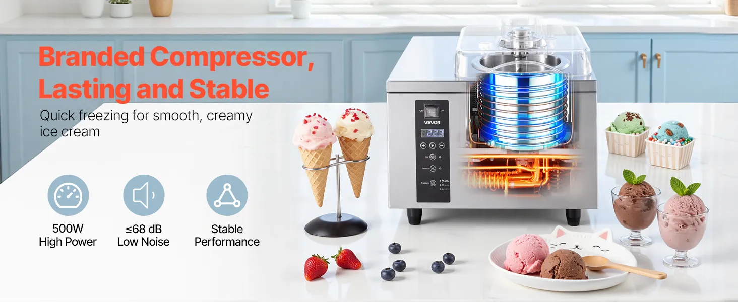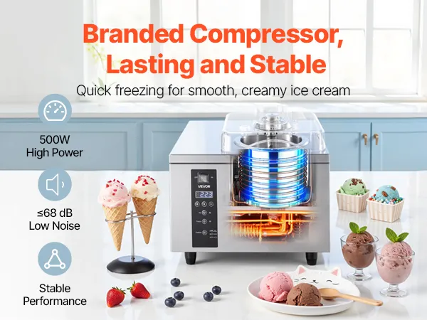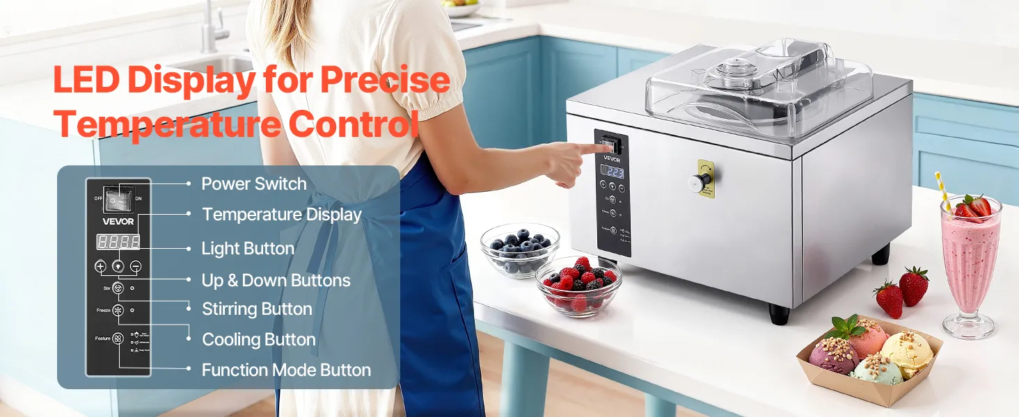 VEVOR Macchina per Ice Cream Duro Gelatiera da Banco 500 W Portata 5L/h per Preparazione di Gelato Duro Sorbetti, Macchina per Icecream Duro Cilindro in Acciaio Inox 304 da 2,8L Pannello LED