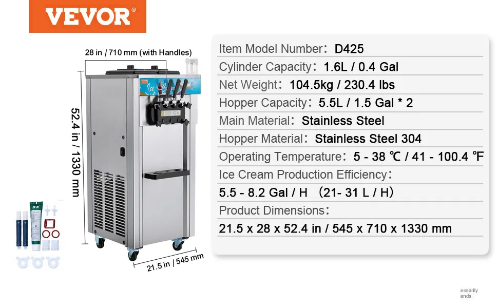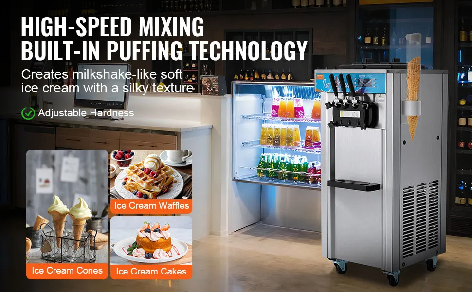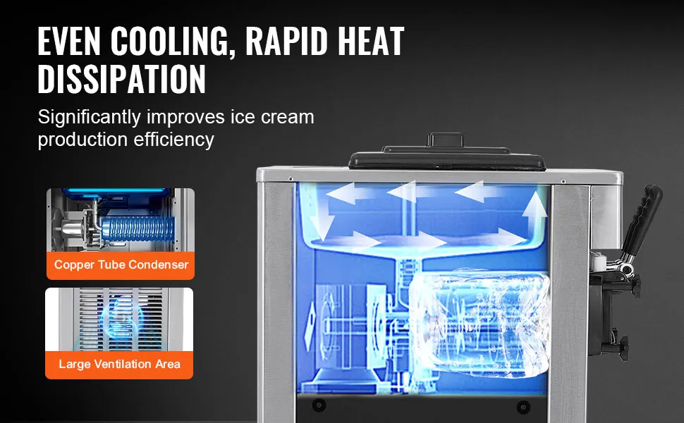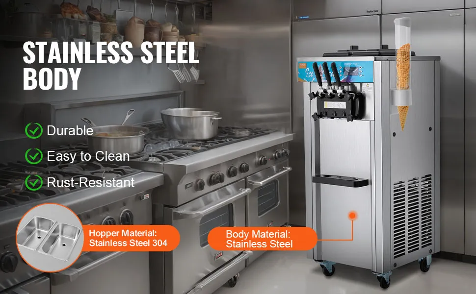 Forte e durevole: Realizzata in acciaio inossidabile 401 di alta qualità e dotata di una tramoggia in acciaio inossidabile SUS304 per uso alimentare, la macchina per gelato soft commerciale è robusta, resistente alla ruggine e facile da pulire, garantendo longevità e sicurezza alimentare.