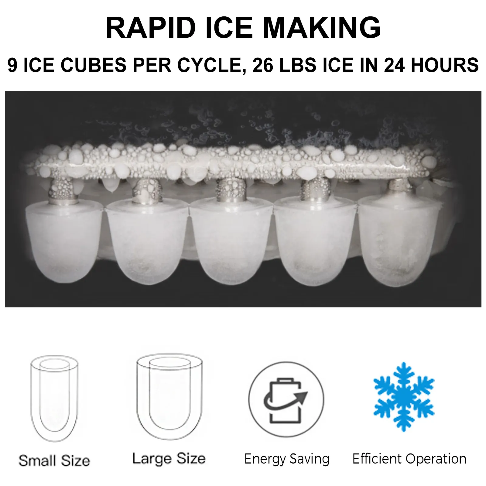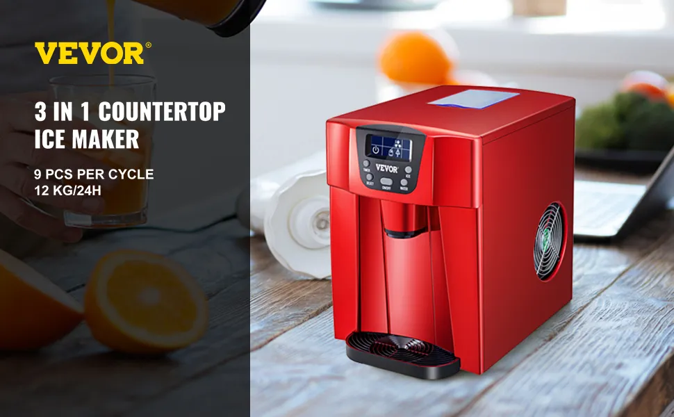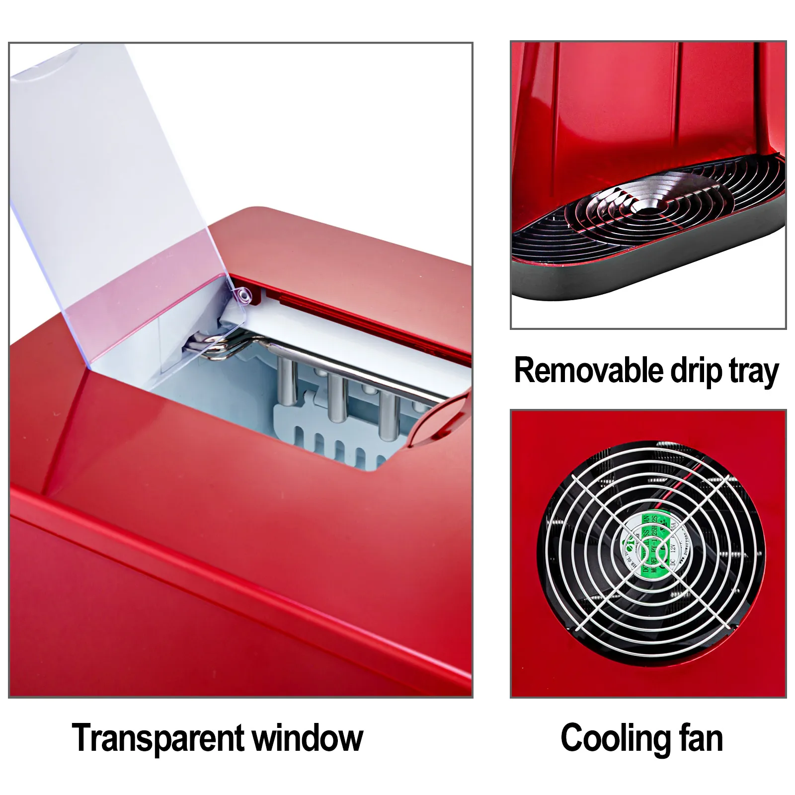 Il produttore di ghiaccio multifunzione da banco produce fino a 26 libbre (12 kg) di ghiaccio al giorno con il potere di creare 9 cubetti di ghiaccio in soli 8 ~ 15 minuti, quindi ci sarà sempre ghiaccio a portata di mano. Dimensioni del ghiaccio regolabili (grande o piccola). Controllo semplice con pulsanti e schermo LCD. Il coperchio trasparente facilita l'osservazione in qualsiasi momento. Design unico per fornire comodamente ghiaccio o acqua potabile fredda.