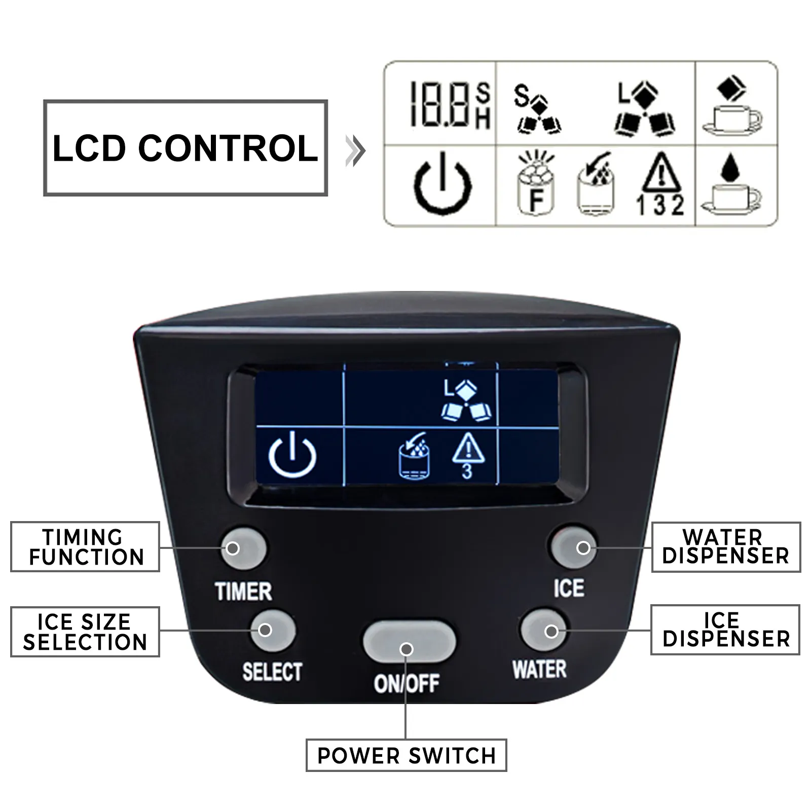Pulsanti di controllo semplici con schermo LCD, che rendono chiaro lo stato dell'operazione a colpo d'occhio. Gli avvisi vengono emessi quando l'acqua è bassa e il contenitore del ghiaccio è pieno. Funzione unica di erogazione di ghiaccio o acqua potabile fresca.