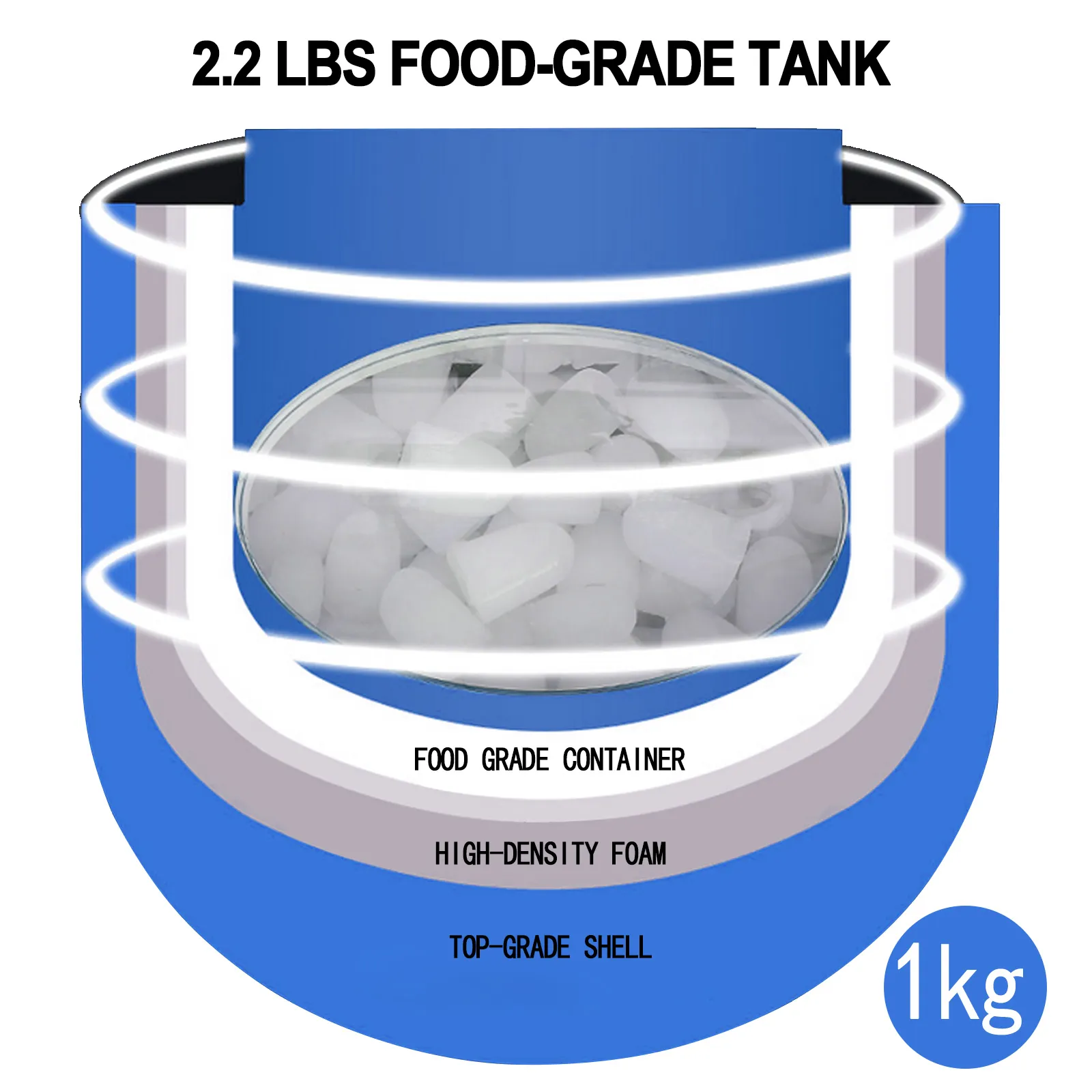 Design a 3 strati del corpo del serbatoio. Contenitore commestibile può contenere fino a 2,2 libbre (1 kg) di ghiaccio. Alta Densità y schiuma aiuta a mantenere la temperatura e isolare il calore. ABS di alta qualità shell, robusto e resistente.