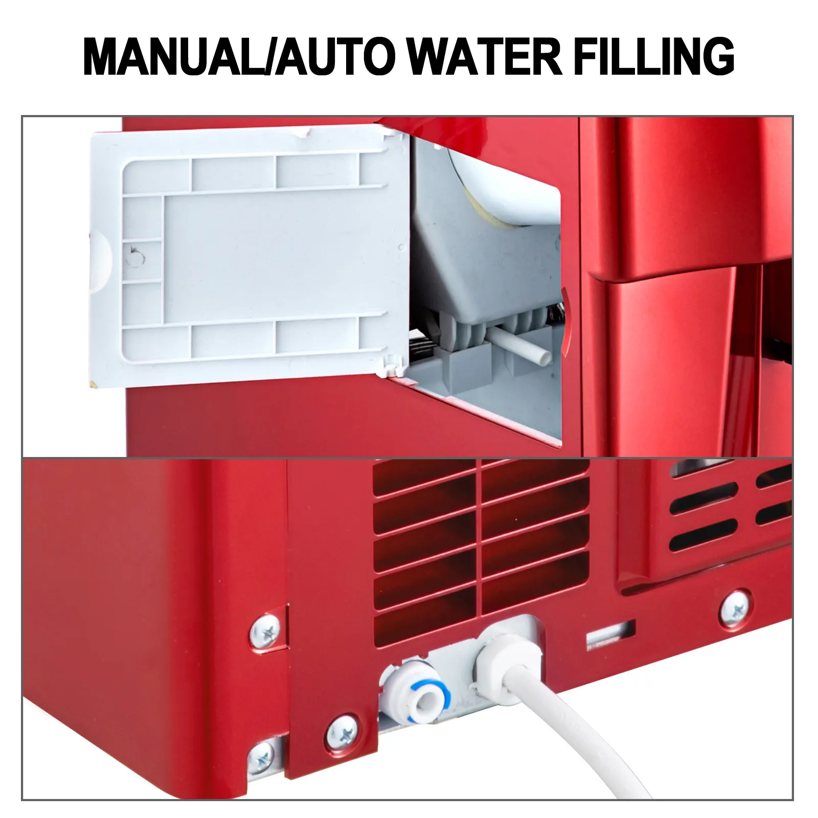 Macchina per ghiaccio portatile, adatta sia al riempimento manuale (utilizzare la porta laterale) sia al riempimento automatico (collegando il tubo dell'acqua sul retro), che consente varie scelte di qualità dell'acqua, soddisfacendo tutti i tipi di requisiti.
