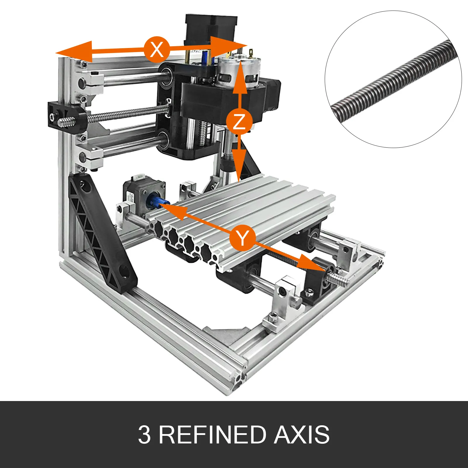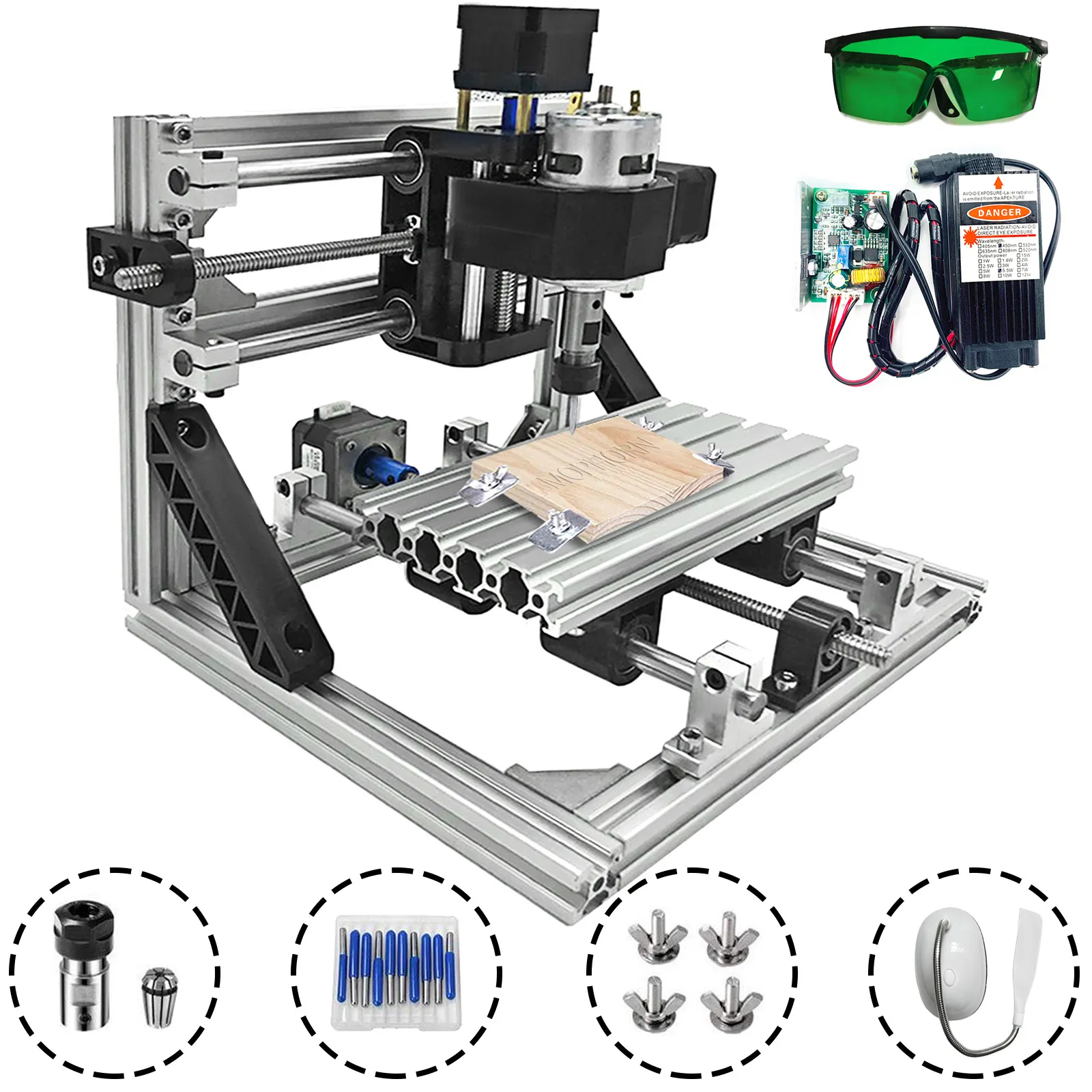 Dotato di tre 42 motori passo-passo su ciascuno dei tre assi per un facile spostamento. Il motore mandrino 775 (12-36 V) 24 V sull'asse Z è in grado di raggiungere la velocità di 10000 giri / min. È incluso un incisore laser extra da 5,5 W, con lunghezza d'onda di 450 nm, che offre un'incisione molto più efficiente.