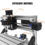 Dotato di tre 42 motori passo-passo su ciascuno dei tre assi per un facile spostamento. Il motore mandrino 775 (12-36 V) 24 V sull'asse Z è in grado di raggiungere la velocità di 10000 giri / min. È incluso un incisore laser extra da 5,5 W, con lunghezza d'onda di 450 nm, che offre un'incisione molto più efficiente.