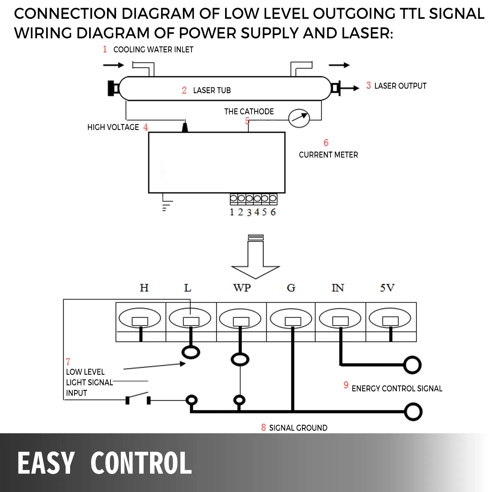 Il livello TTL controlla facilmente l'avvio e l'arresto dell'alimentazione laser. Ogni dato è contrassegnato per comodità.