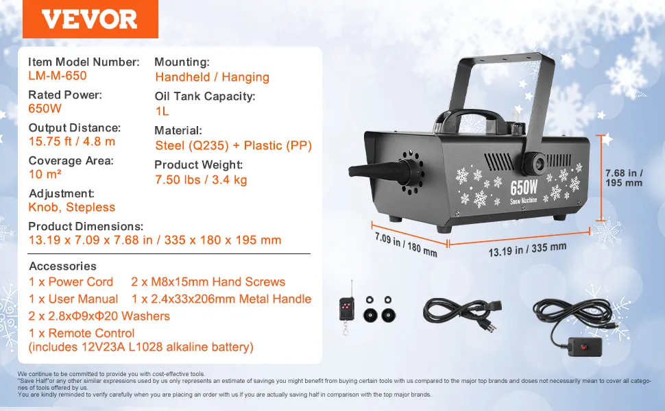 Produzione di neve efficiente: la macchina per la neve VEVOR è dotata di un potente motore da 650 W e di un serbatoio d'acqua di grande capacità da 1 L, che le consente di produrre un flusso continuo di fiocchi di neve realistici. Con una distanza di spruzzo di 3-5 metri e un'area di copertura di 10㎡, assicura che il tuo spazio sia splendidamente ricoperto di neve.