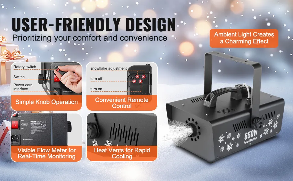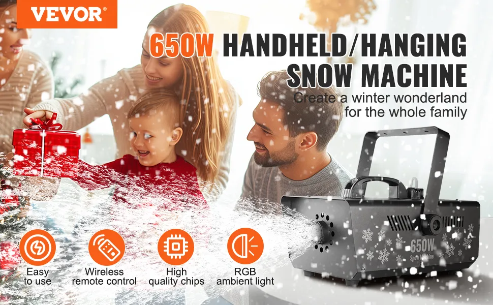 Facile da usare: la velocità di uscita della neve regolabile semplifica l'adattamento a diverse impostazioni e crea l'atmosfera romantica per qualsiasi evento. La macchina per la neve è dotata di un telecomando wireless che funziona entro un raggio.