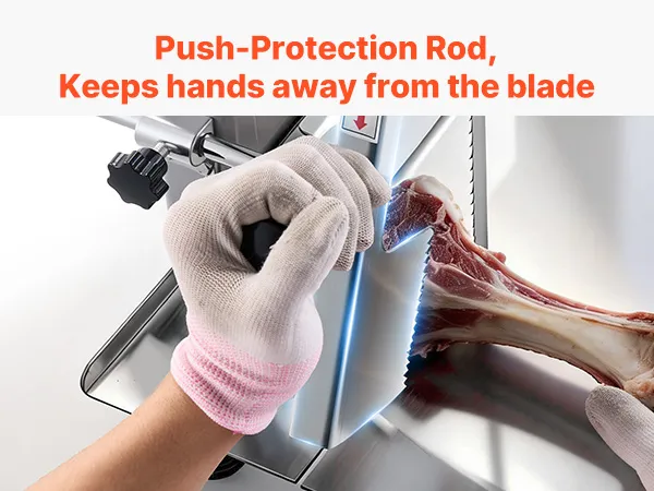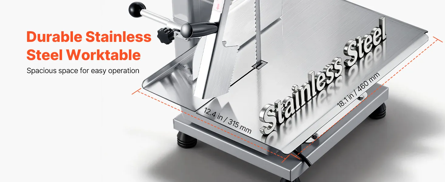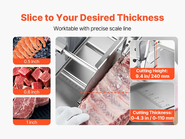 Risultati precisi e uniformi: La superficie di lavoro della troncatrice per carne e ossa è dotata di precise scale di riferimento e di una piastra di guida regolabile, che consente un controllo accurato dello spessore da 0 a 110 mm
