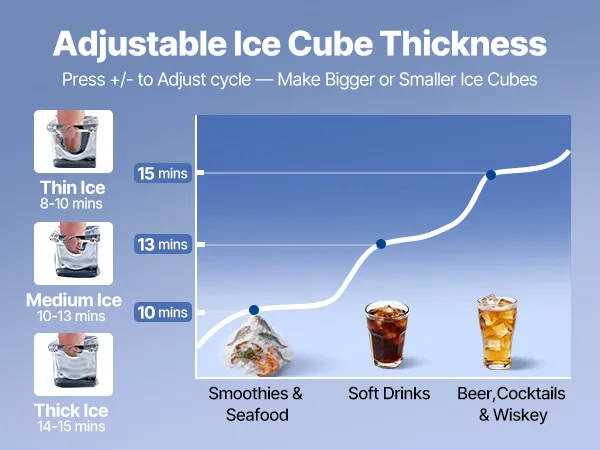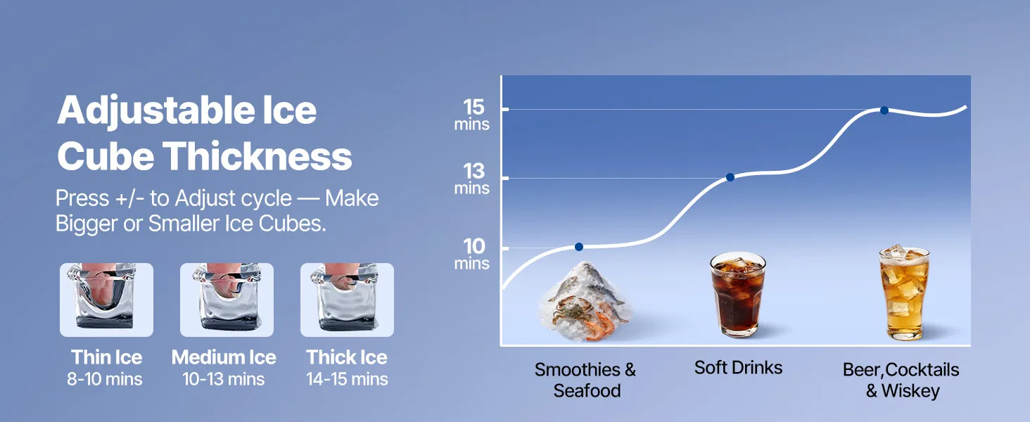 • Controllo intelligente e funzionamento semplice: Il pannello LED visualizza la temperatura ambiente e offre la possibilità di regolare lo spessore dei cubetti di ghiaccio. È inoltre dotato di timer, pulizia con un solo tocco e avvisi per livelli bassi di ghiaccio/acqua/errori