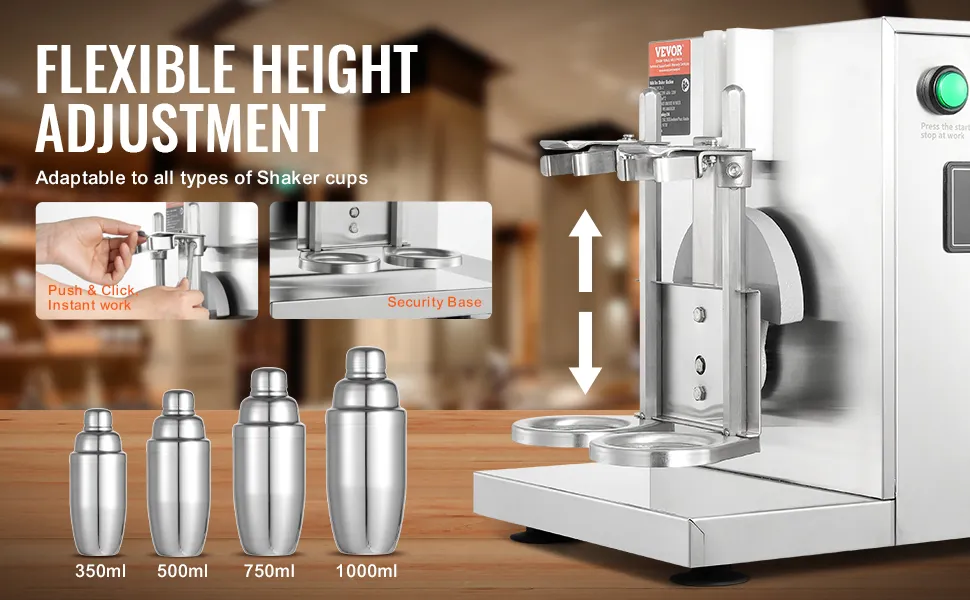 Compatibile con più dimensioni di tazze shaker: puoi regolare rapidamente l'altezza del supporto della macchina shaker per adattarsi a tazze shaker di diverse dimensioni, da 350 ml a 750 ml, assicurando che ogni bevanda venga agitata in modo uniforme e rapido. Include due shaker in acciaio inossidabile da 750 ml, facili da pulire e che non trattengono i sapori, adatti per l'uso in tutti i tipi di strutture di ristorazione.