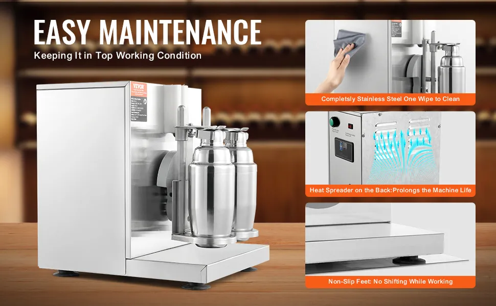 La manutenzione e la pulizia rappresentano spesso una sfida importante nel funzionamento quotidiano del negozio di bevande, la nostra macchina per agitare il tè al latte è realizzata in acciaio inossidabile, facile da pulire, resistente e dotata di piedini antiscivolo.