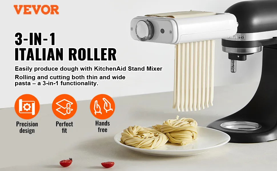 Il tuo mixer KitchenAid può trasformarsi in una potente macchina per la pasta con l'accessorio per la pasta VEVOR! Questo accessorio è compatibile con tutti i modelli di mixer KitchenAid, rendendolo l'aggiunta perfetta ai tuoi utensili da cucina. Con il set di tagliapasta 3 in 1, puoi stendere, tagliare sottile e tagliare largamente la pasta in una volta sola. Non c'è bisogno di cambiare accessorio: questa funzione ti fa risparmiare tempo e fatica. È perfetto per preparare rapidamente pasta fresca fatta in casa. Che tu stia preparando spaghetti o fettuccine, questo accessorio rende la preparazione della pasta semplice e divertente. Goditi una deliziosa pasta fatta in casa ogni volta con il minimo fastidio.