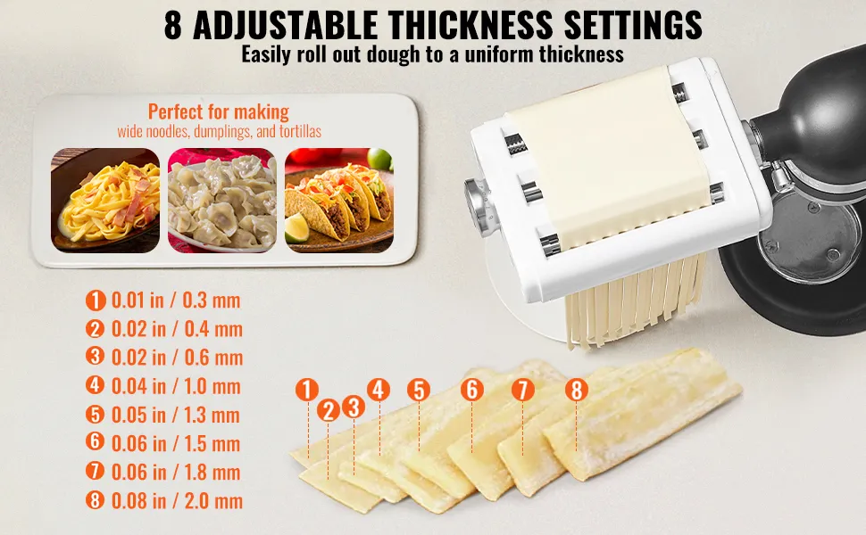 Con l'accessorio per pasta VEVOR per KitchenAid, puoi creare la pasta esattamente come la desideri. Regola lo spessore della tua pasta da 0,01 a 0,08 pollici per risultati uniformi. Questa macchina per la pasta con spessore regolabile assicura che la tua pasta sia sempre perfetta. Che tu stia preparando tagliatelle larghe o ravioli delicati, le impostazioni di precisione ti consentono di ottenere la consistenza esatta della pasta che desideri. Perfetto per creare facilmente una varietà di piatti di pasta, questo accessorio offre flessibilità e controllo per le tue esigenze di cottura.