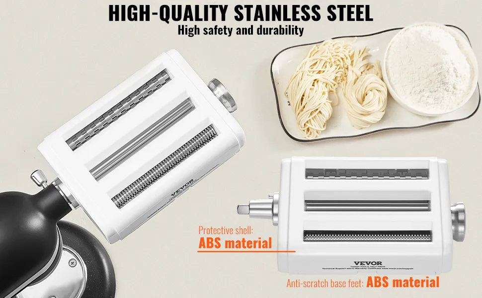 Materiali di alta qualità e sicuri per gli alimenti compongono questo accessorio per la pasta. Realizziamo l'albero per stendere la pasta in acciaio inossidabile 304 e l'albero di taglio in resistente acciaio inossidabile 303. Questi materiali garantiscono sia resistenza che sicurezza per l'uso alimentare. Il robusto materiale ABS costruisce la calotta protettiva, assicurando che l'accessorio rimanga durevole e non si usuri nel tempo. Puoi essere certo che utilizziamo materiali sicuri e di alta qualità per preparare la tua pasta, rendendola ideale per piatti sani e fatti in casa.