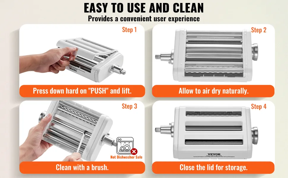 Questo accessorio per pasta VEVOR per KitchenAid è incredibilmente semplice da usare. Basta montarlo sul tuo mixer KitchenAid, accenderlo e iniziare a fare la pasta. Il suo corpo rimovibile consente una pulizia semplice: basta premere "PUSH" e sollevare per pulire con la spazzola in dotazione. La pulizia è rapida e semplice, assicurando che l'accessorio rimanga in condizioni eccellenti per molti utilizzi. Questa praticità ti fa risparmiare tempo e fatica, rendendolo perfetto per chiunque ami la pasta fatta in casa. Goditi la facilità d'uso e la pulizia senza sforzo con questo versatile accessorio.