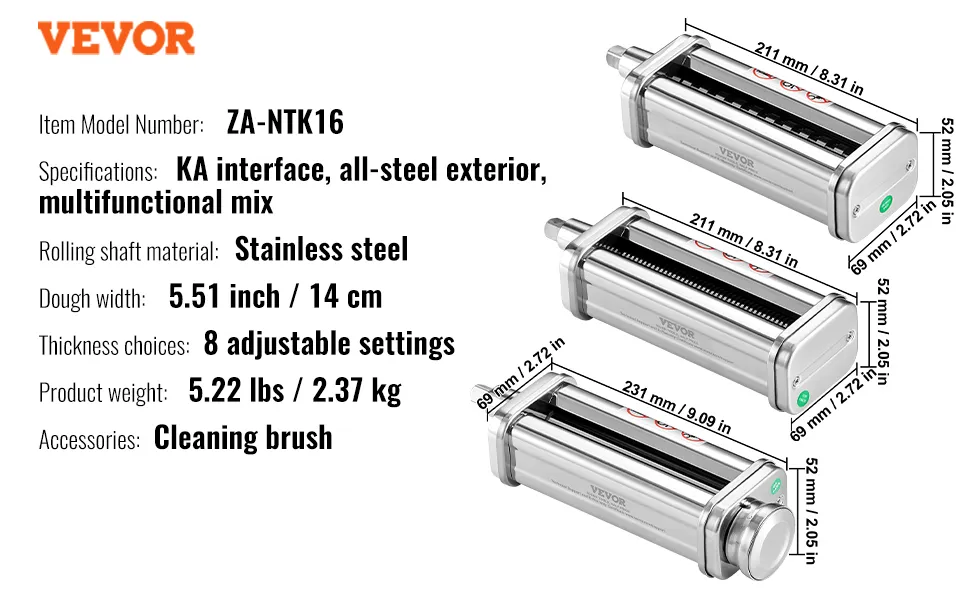 Questo accessorio per pasta VEVOR per il robot da cucina KitchenAid offre due opzioni di larghezza della pasta: 0,06 pollici e 0,24 pollici. Che tu stia preparando spaghetti sottili o fettuccine più larghe, queste scelte di larghezza ti consentono di creare diverse forme di pasta per soddisfare i gusti della tua famiglia. La versatilità di queste larghezze di pasta semplifica la sperimentazione di piatti diversi e porta varietà ai tuoi pasti, rendendolo lo strumento perfetto sia per i cuochi casalinghi che per gli chef professionisti.