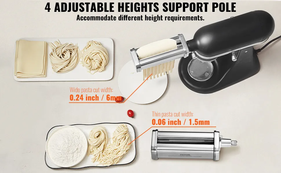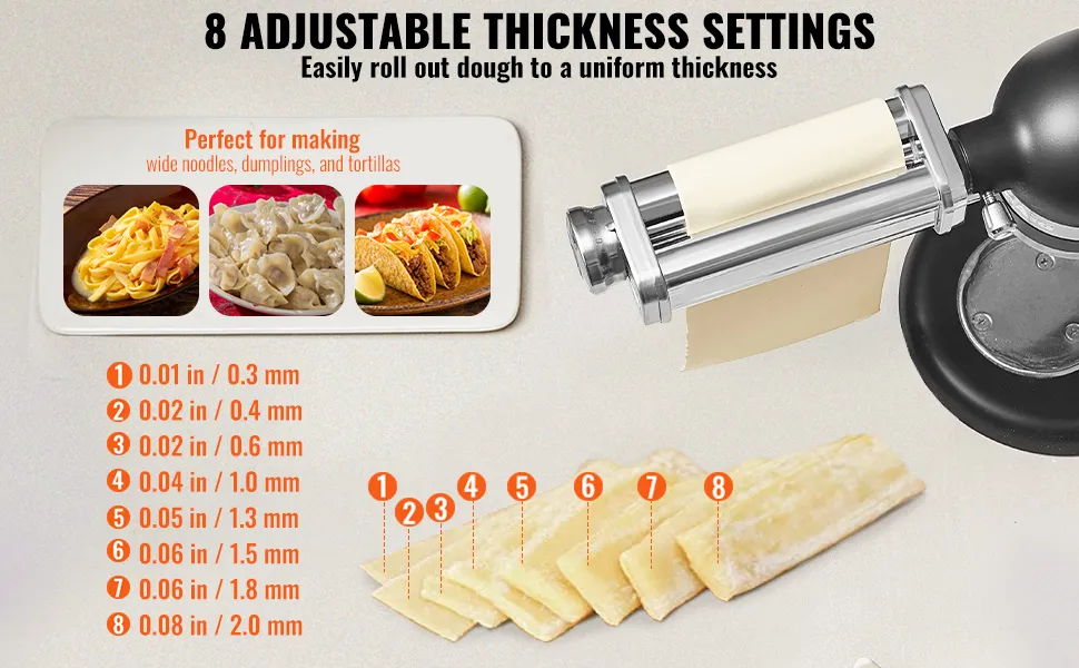 Questo accessorio per macchina per la pasta KitchenAid di VEVOR è dotato di una macchina per la pasta con spessore regolabile con impostazioni che vanno da 0,01 a 0,08 pollici, dandoti il controllo completo sulla consistenza della tua pasta. Che tu stia realizzando delicati spaghetti o fettuccine più spesse, questo accessorio per macchina per la pasta KitchenAid assicura un risultato perfetto ogni volta. È ideale per vari piatti di pasta, dai ravioli fatti in casa alle tortillas e persino alle torte a strati. La sua funzione di spessore regolabile rende questo accessorio uno strumento da cucina essenziale per chiunque desideri creare pasta di qualità da ristorante a casa.