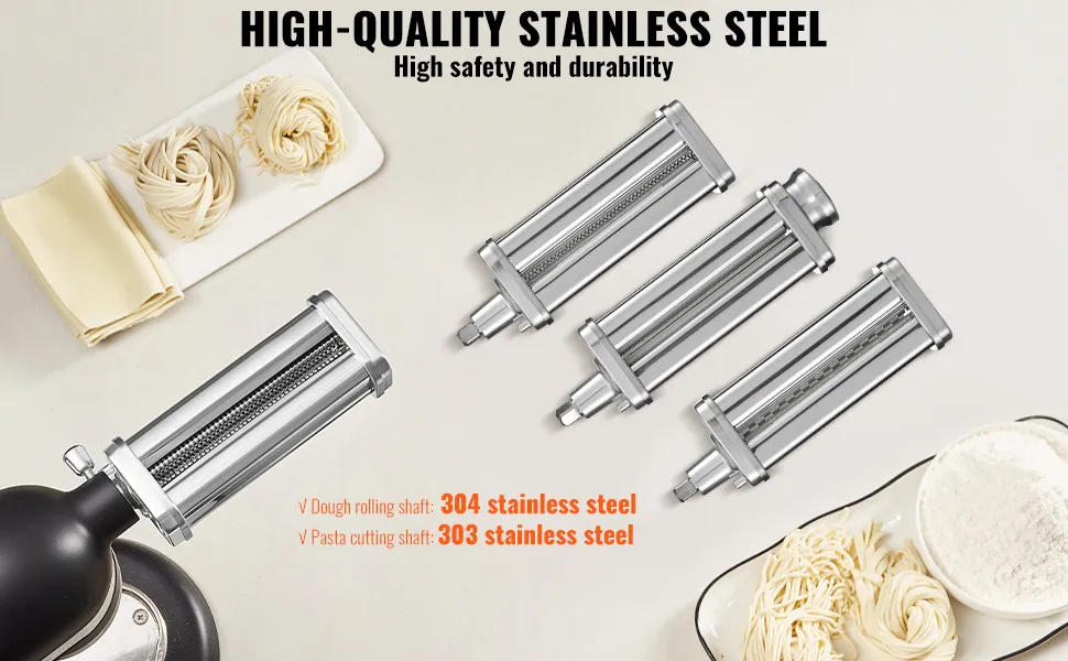 Materiali di qualità alimentare di prima qualità realizzano l'accessorio per la pasta VEVOR per l'impastatrice KitchenAid, garantendo una preparazione della pasta sicura e affidabile. Utilizziamo acciaio inossidabile 304 per l'albero di stesura della pasta e acciaio inossidabile 303 resistente per l'albero di taglio. Questi materiali non sono solo resistenti alla ruggine e alla corrosione, ma sono anche costruiti per durare con un uso frequente. Ciò garantisce sia durevolezza che longevità, offrendo tranquillità mentre prepari i tuoi piatti di pasta preferiti per la tua famiglia e i tuoi ospiti.
