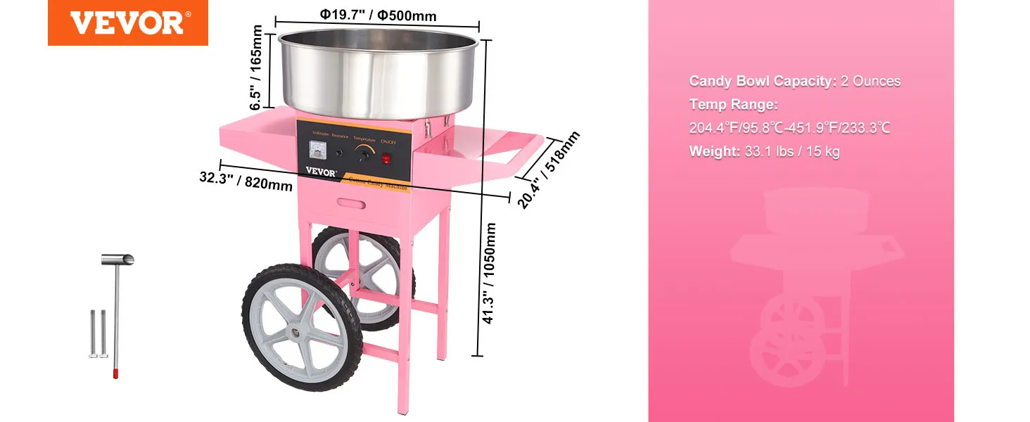 VEVOR Macchina per Zucchero Filato Carrello Commerciale 1000W Capienza Ciotola 57g, Macchinetta per Zucchero Filato Soffice Temperatura Regolabile tra 95-233°C ca. per Festa Carnevale Evento Esterno