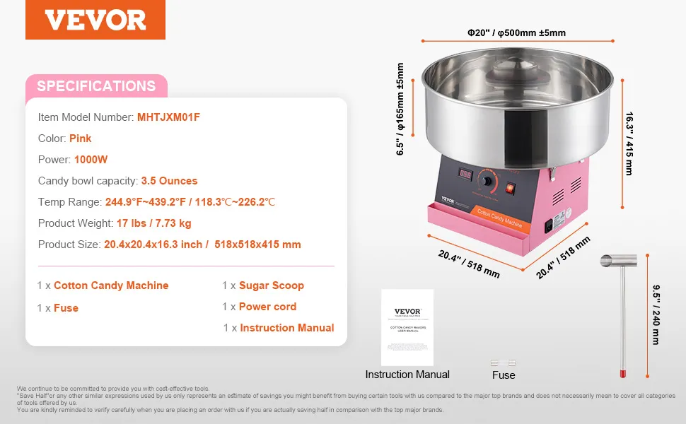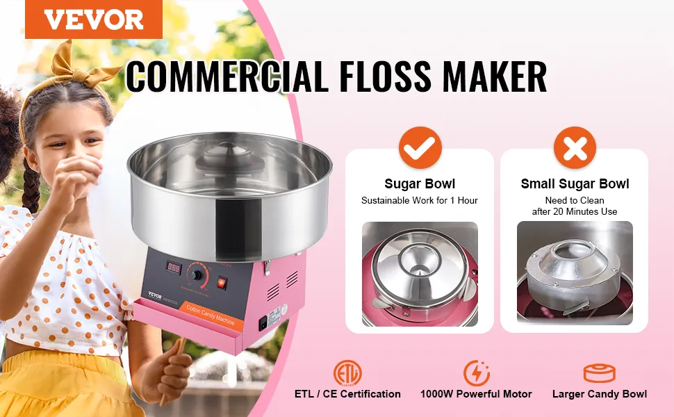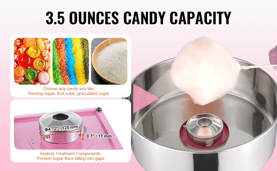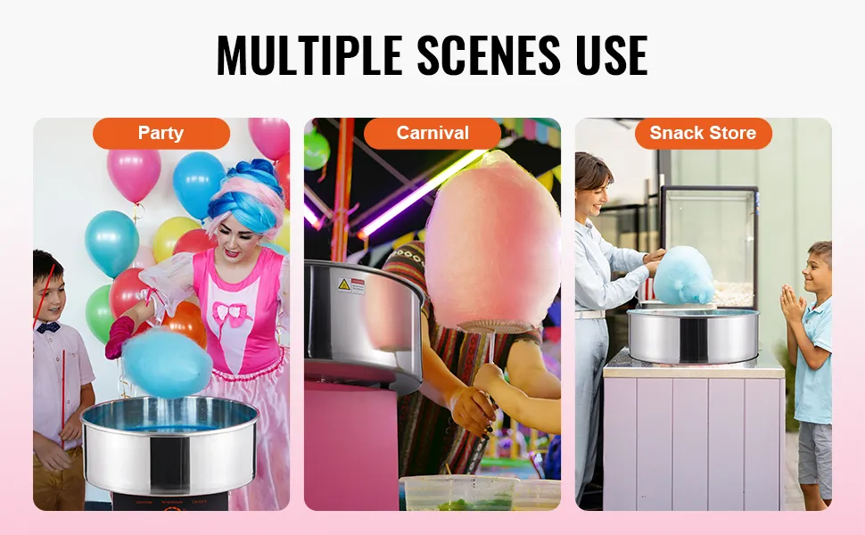 Lavora con qualsiasi caramella che ti piace: questa macchina per il cotone ti consente di utilizzare i tradizionali zuccheri del filo interdentale, lo zucchero del latte, i cubetti di frutta o qualsiasi delle tue caramelle dure preferite per creare deliziosi zucchero filato. Con dimensioni compatte, è adatto per l'uso su bancone ed è perfetto per carnevali, festival, feste di compleanno ed eventi sportivi.