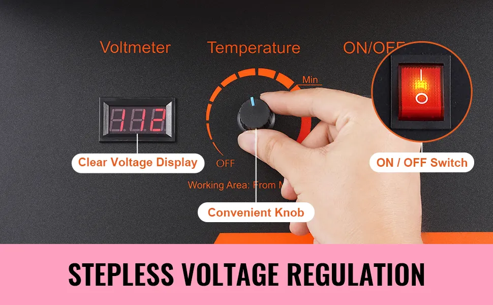 Il pannello di controllo è dotato di una manopola di regolazione continua della tensione. La tensione è regolabile e la variazione di tensione può essere visualizzata tramite il voltmetro.