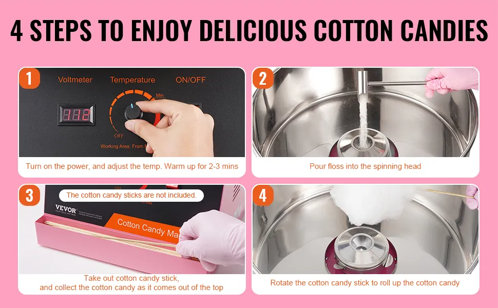 Processo di funzionamento semplice: l'utilizzo di questa macchina non potrebbe essere più semplice. Accendi l'alimentazione, regola la temperatura, riscalda per 2-3 minuti e versa lo zucchero nella testa rotante, quindi devi solo usare i bastoncini per raccogliere lo zucchero filato dalla testa.