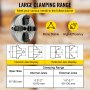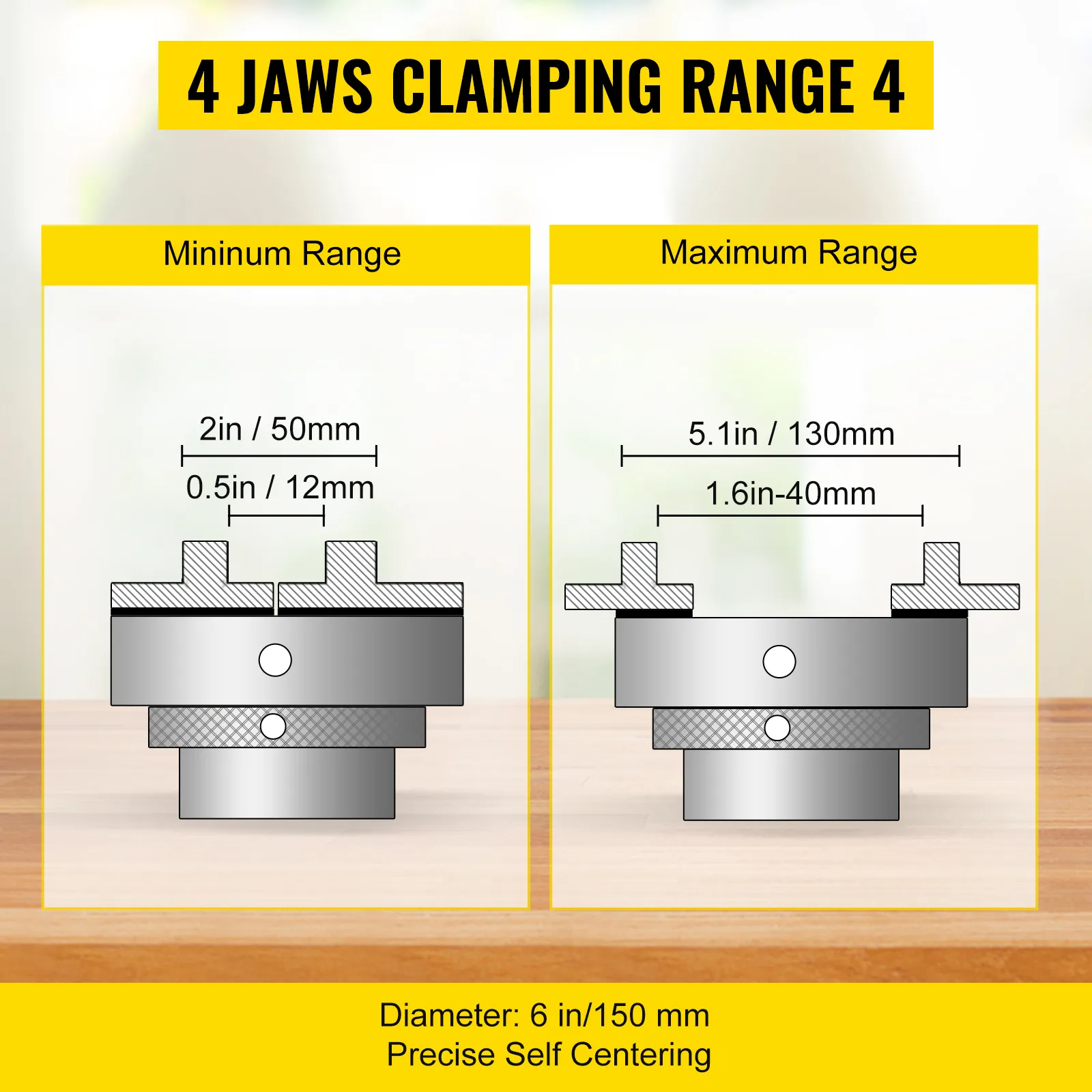 Quattro ganasce possono essere regolate separatamente. Gamma di serraggio interno delle ganasce: 0,5-2,0 pollici (12-50 mm). Gamma di serraggio esterno delle ganasce: 1,5-5,1 pollici (40-130 mm).