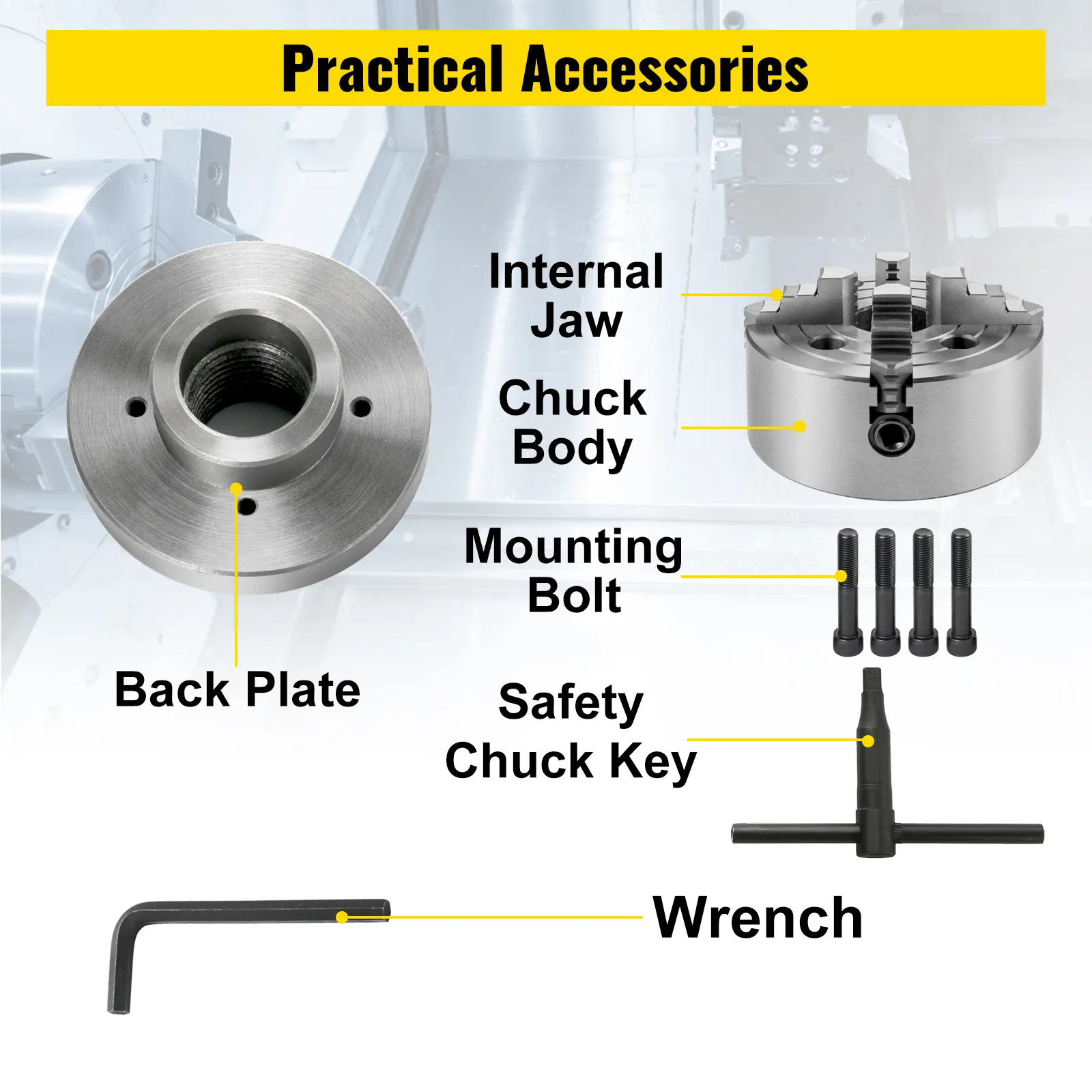 Questo mandrino del tornio in metallo è composto da un corpo del mandrino, una chiave del mandrino di sicurezza, una piastra di adattamento e bulloni di montaggio. Tutte queste parti ti consentono di installarle rapidamente.