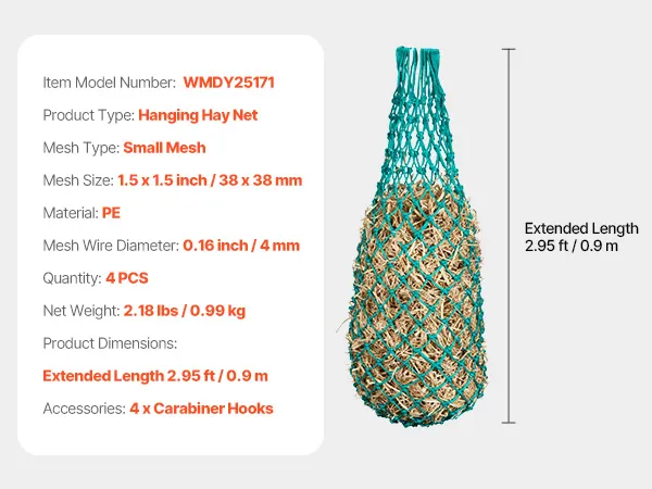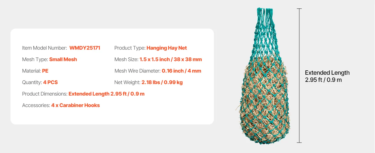 VEVOR Reti da Fieno per Cavalli 4 Pezzi Lunghezza Estesa 0,9 m Fori 38 x 38 mm, Materiale PE, con Quattro Moschettoni, Rete per Alimentazione Lenta per Cavalli, Pecore, Bovini, Alpaca e Bestiame
